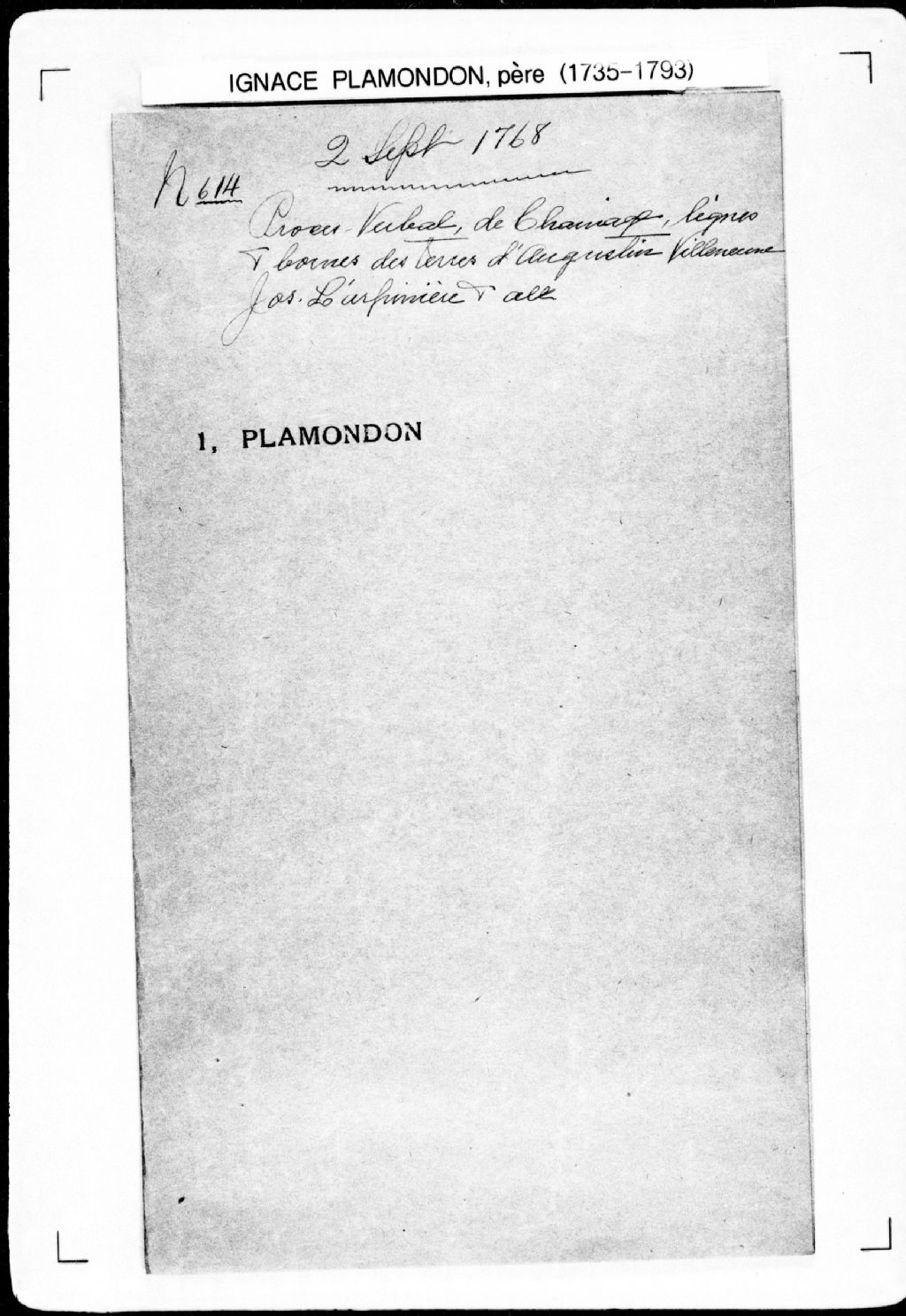Procès-verbal de partage du restant de l'arrière-fief Maheu et de chaînage, lignes et bornes des portions, lequel fief étant situé à la troisième concession, près du chemin Royal, dans la seigneurie de Saint-Augustin [seigneurie de Maur]. La présente pièce concerne directement: Augustin Villeneuve; Louis-Joseph Larpinière (Lerpinière); Ignace Cliche; Joseph Villeneuve; Paul Bussière (arpenteur Ignace Plamondon père), 2 septembre 1768, Archives nationales à Québec, Fonds Cour supérieure. District judiciaire de Québec. Greffes d'arpenteurs, (03Q,CA301,S43,P614).
