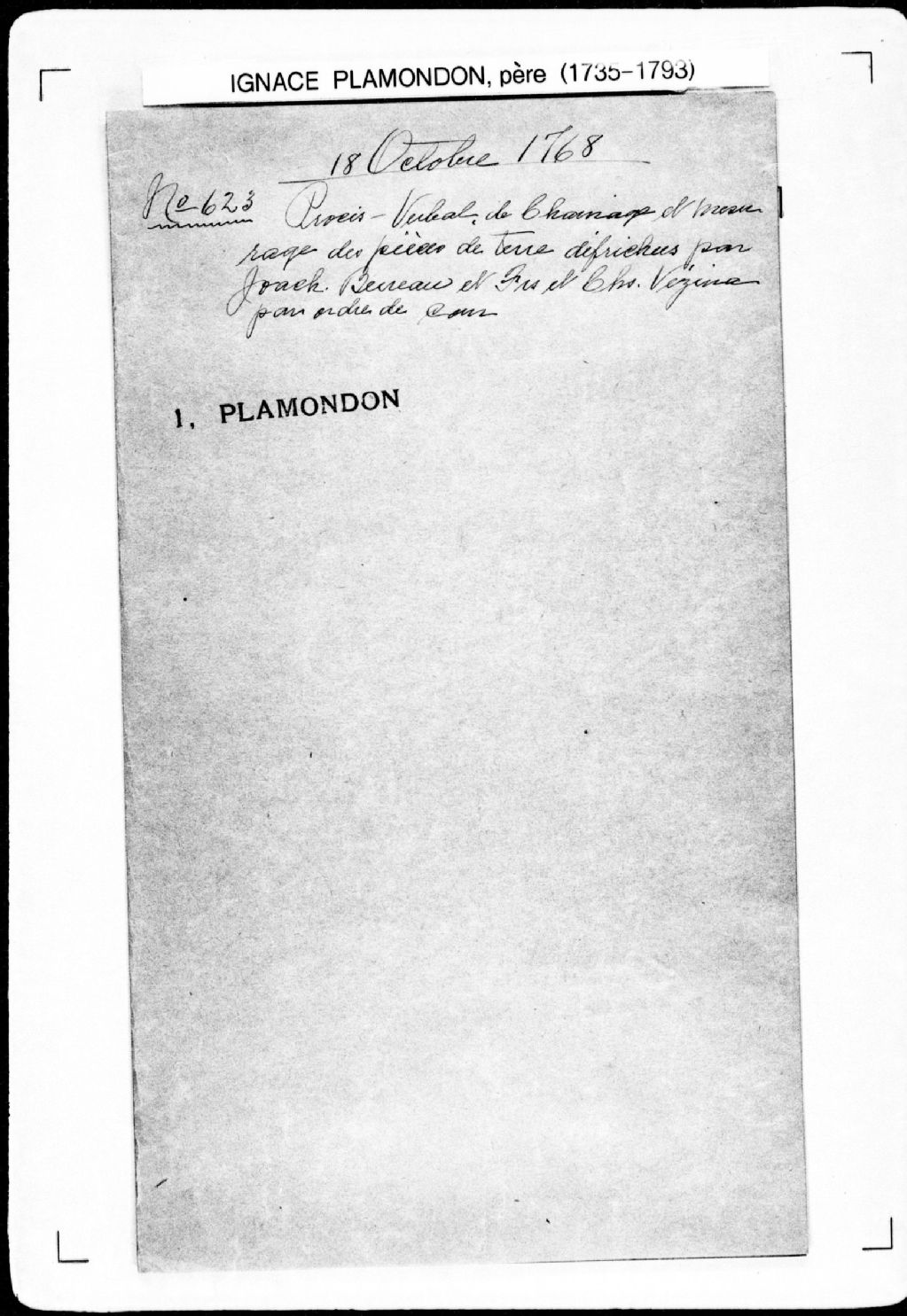 - Procès-verbal de mesurage de neuf pièces et morceaux de terre défrichés, en exécution d'un arrêt rendu en la Cour des Plaidoyers communs du district de Québec, lesquels pièces et morceaux de terre étant situés à la côte de Beaupré, entre la rivière du saut Montmorency et la ligne séparant la seigneurie de la Côte-de-Beaupré et la seigneurie de Beauport, dans ladite seigneurie de la Côte-de-Beaupré.