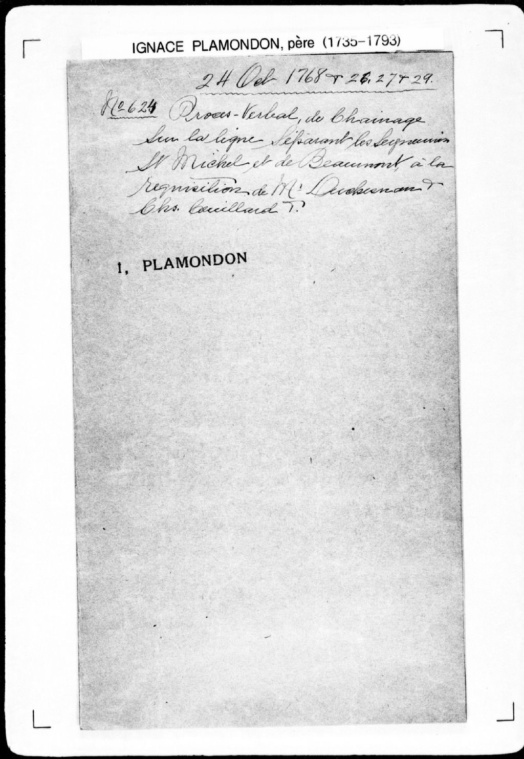 Procès-verbal de chaînage sur la ligne séparant la seigneurie de Saint-Michel et la seigneurie de Beaumont. La présente pièce concerne directement: le sieur Decheneaud (Deschenaux), seigneur des seigneuries de Saint-Michel, Livaudière, Neuville et autres lieux; Charles Coullard (Couillard), écuyer, seigneur primitif de la seigneurie de Beaumont; Jean-Baptiste Girard, coseigneur de la seigneurie de Beaumont (arpenteur Ignace Plamondon père), 24 octobre 1768 - 25 octobre 1768, Archives nationales à Québec, Fonds Cour supérieure. District judiciaire de Québec. Greffes d'arpenteurs, (03Q,CA301,S43,P624-1).