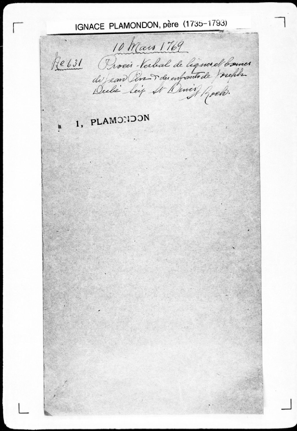Procès-verbal de bornes séparant deux terres sur la ligne séparant la seigneurie de Saint-Denis (seigneurie de Saint-Roch-des-Aulnaies; seigneurie de la Grande-Anse) et la seigneurie d'Auteuil [seigneurie de Rhéaume; seigneurie de l'Îlet-à-la-Peau]. La présente pièce concerne directement: Jean Pin (Pain); Jacques Dupon (Dupont) (arpenteur Ignace Plamondon père), 10 mars 1769, Archives nationales à Québec, Fonds Cour supérieure. District judiciaire de Québec. Greffes d'arpenteurs, (03Q,CA301,S43,P631).
