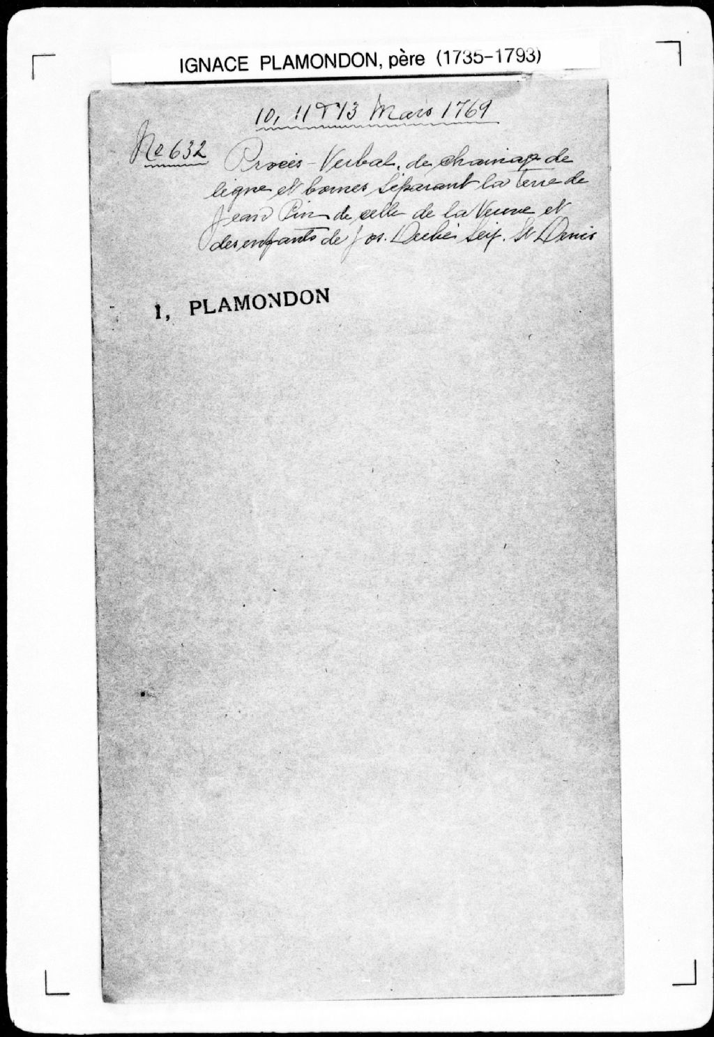 Procès-verbal de ligne et borne séparant deux terres à partir de la ligne séparant la seigneurie de Saint-Denis (seigneurie de Saint-Roch-des-Aulnaies; seigneurie de la Grande-Anse) et la seigneurie d'Auteuil (seigneurie de l'Îlet-à-la-Peau), lesquelles terres étant situées dans ladite seigneurie de Saint-Denis. La présente pièce concerne directement: Jean Pin (Pain); Marie-Rosalie Morin, veuve de feu Joseph Dubé, et ses enfants mineurs (arpenteur Ignace Plamondon père), 10 mars 1769, Archives nationales à Québec, Fonds Cour supérieure. District judiciaire de Québec. Greffes d'arpenteurs, (03Q,CA301,S43,P632-1).
