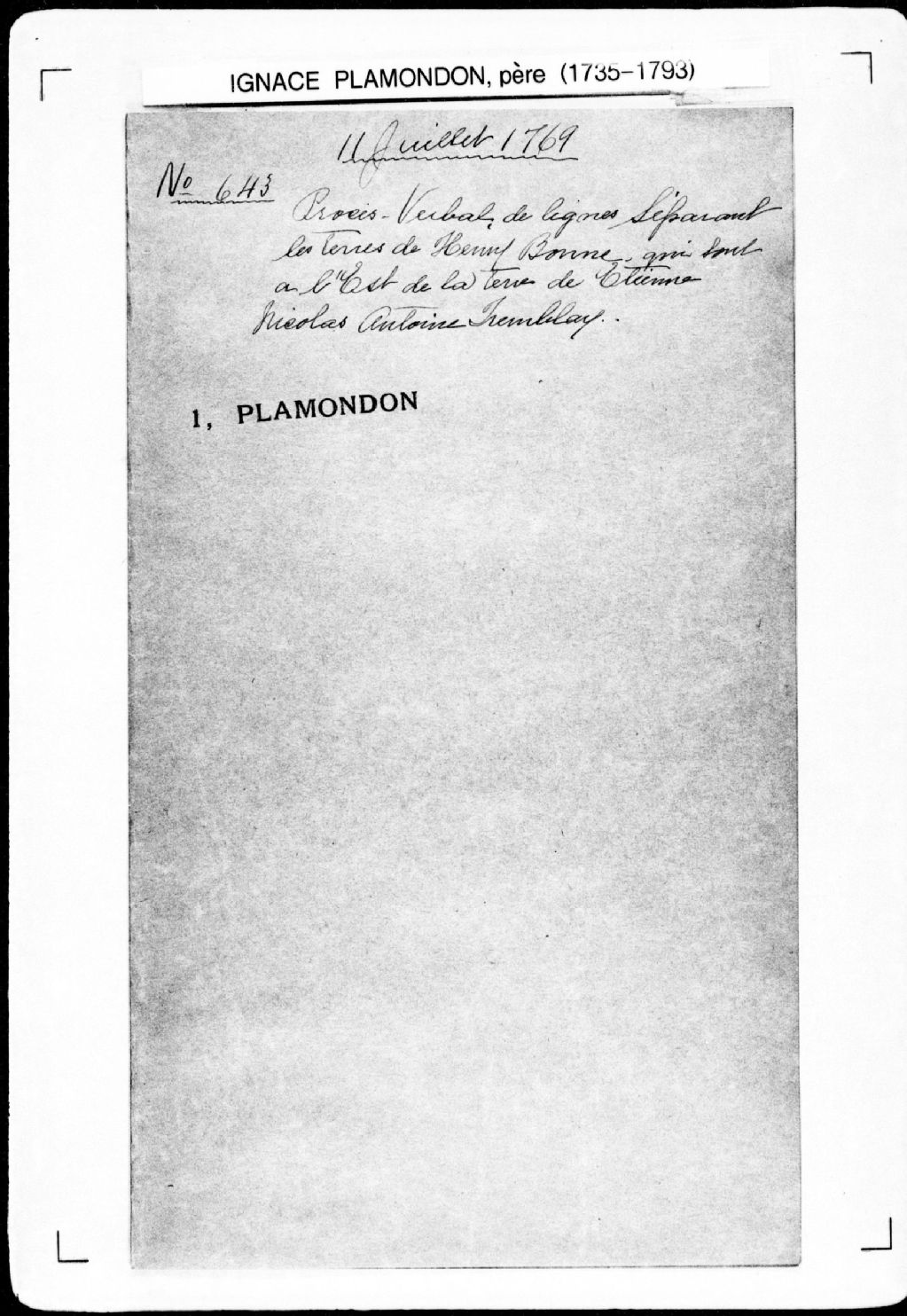 Procès-verbal de ligne séparant deux terres situées dans la [seigneurie des Éboulements]. La présente pièce concerne directement: Henri Bonne (Baune, Baulne, Debonne); Étienne Tremble (Tremblay); Antoine Tremble (Tremblay) (arpenteur Ignace Plamondon père), 11 juillet 1769, Archives nationales à Québec, Fonds Cour supérieure. District judiciaire de Québec. Greffes d'arpenteurs, (03Q,CA301,S43,P643).