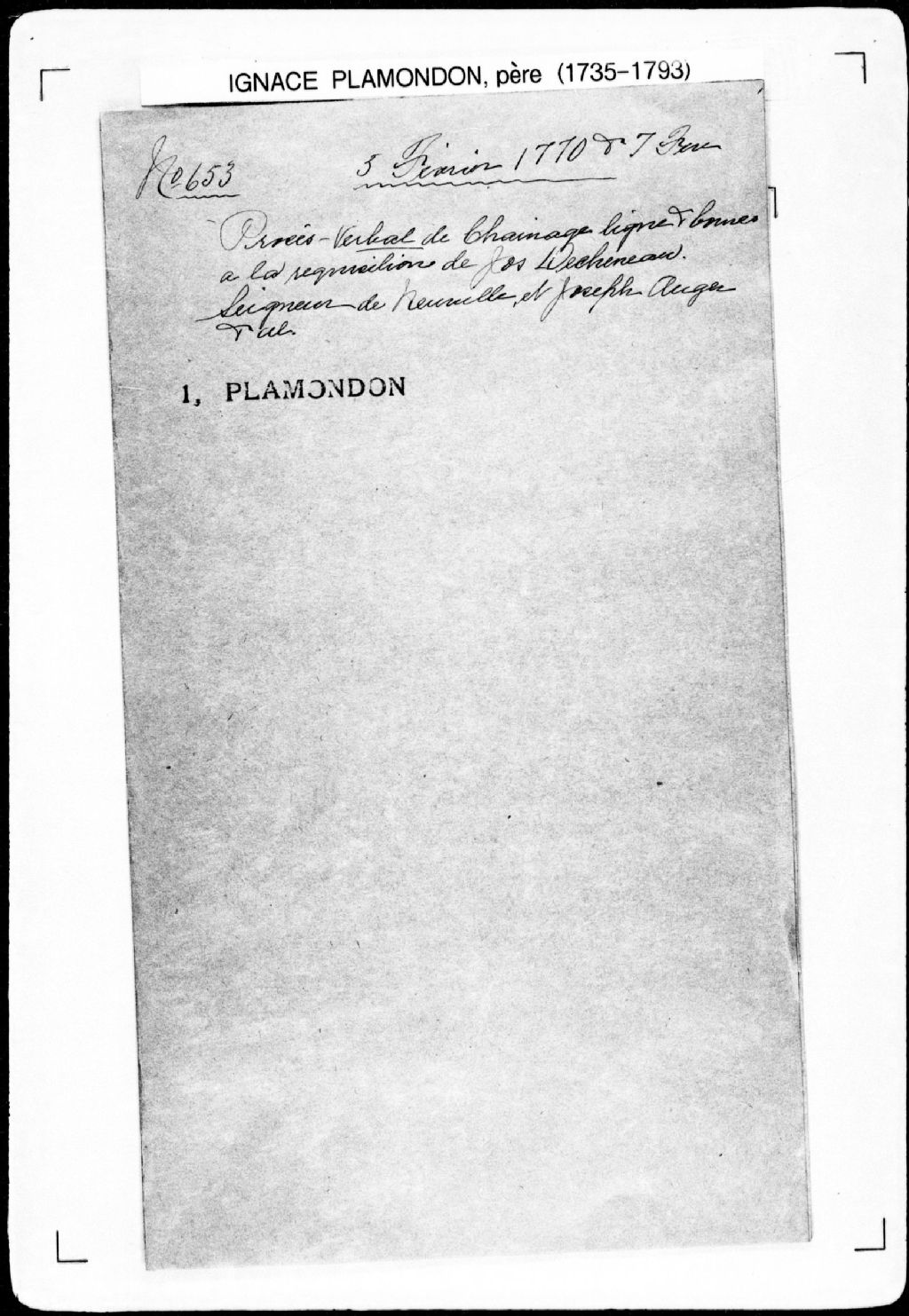 Procès-verbal de chaînage et ligne de deux terres situées dans la seigneurie de Neuville. La présente pièce concerne directement: Ange Garnaud (Garneau); Jean Grégoire; Pierre Savary; Joseph Grenier; Gabriel Trudel (arpenteur Ignace Plamondon père), 5 février 1770 - 6 février 1770, Archives nationales à Québec, Fonds Cour supérieure. District judiciaire de Québec. Greffes d'arpenteurs, (03Q,CA301,S43,P653-1).