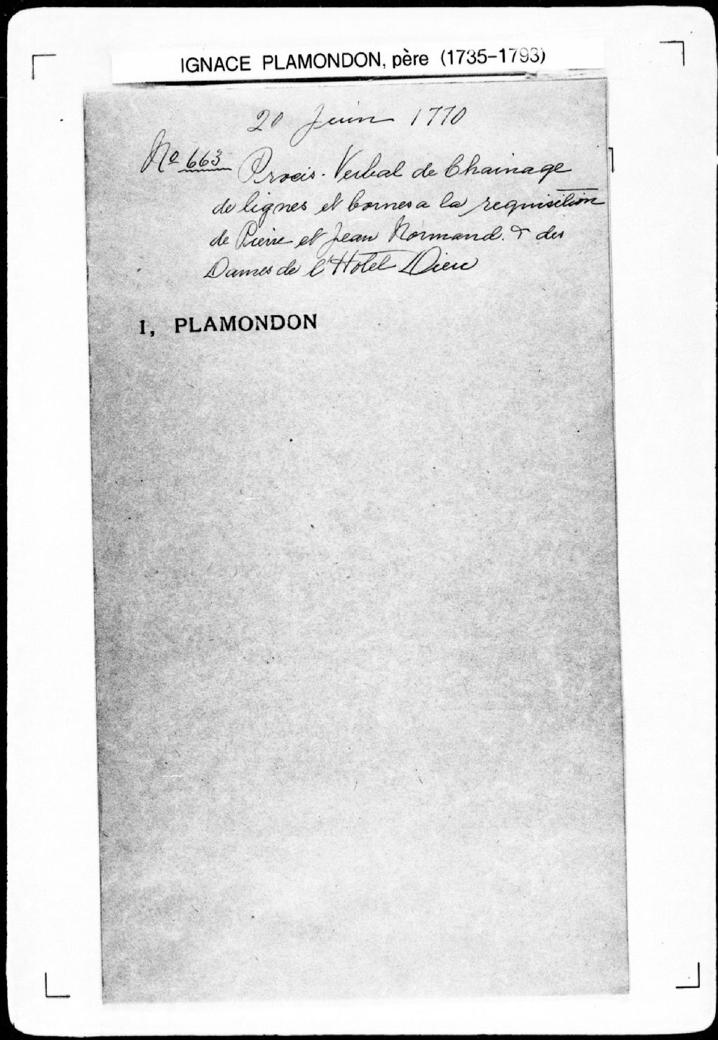 Procès-verbal de ligne et bornes séparant deux terres situées au lieu nommé La Canardière, dans la seigneurie de Notre-Dame-des-Anges. La présente pièce concerne directement: Pierre Normand; Jean Normand; les Dames Religieuses de l'Hôtel-Dieu de Québec (arpenteur Ignace Plamondon père), 20 juin 1770, Archives nationales à Québec, Fonds Cour supérieure. District judiciaire de Québec. Greffes d'arpenteurs, (03Q,CA301,S43,P663-1).
