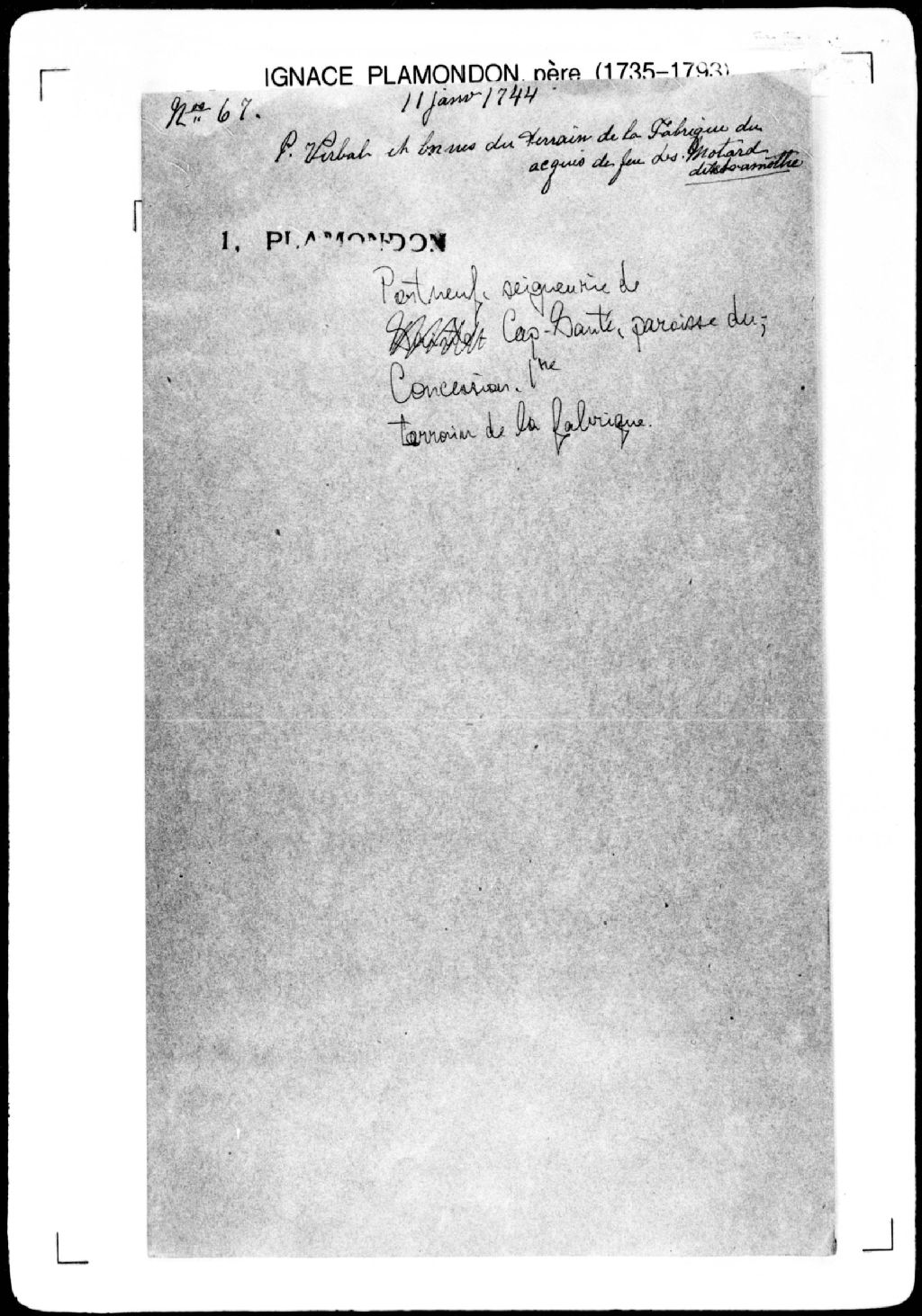 - Procès-verbal de chaînage, lignes et bornes de deux terrains situés à la première concession, le long du chemin Royal, au bord des écores (rives, grève) (pour le premier terrain) et depuis le vieux presbytère jusqu'au sud-ouest d'une vieille grange (pour le deuxième terrain), dans la paroisse de la Sainte-Famille-du-Cap-Santé, baronnie de Portneuf.