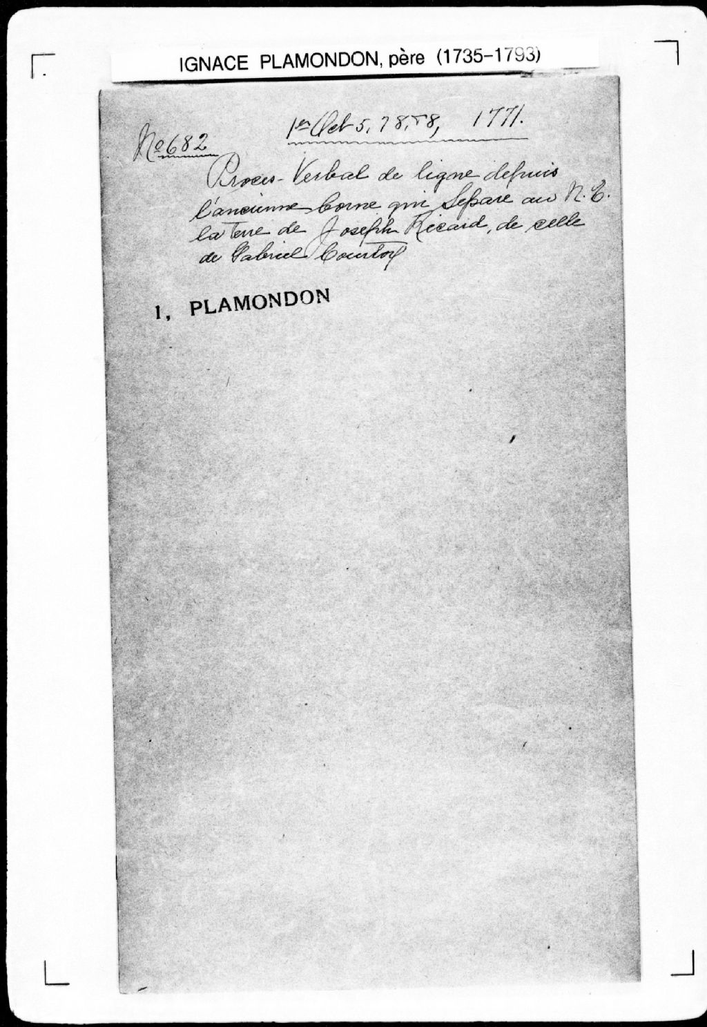 Procès-verbal de ligne et borne séparant deux terres situées au village Sainte-Anne, dans la [paroisse de Sainte-Anne], [seigneurie de Chorel] [seigneurie de Sainte-Anne-de-la-Pérade]. La présente pièce concerne directement: Joseph Grimard; Marie-Josèphe Courtoy (Courtois) (arpenteur Ignace Plamondon père), 5 octobre 1771, Archives nationales à Québec, Fonds Cour supérieure. District judiciaire de Québec. Greffes d'arpenteurs, (03Q,CA301,S43,P682-2).
