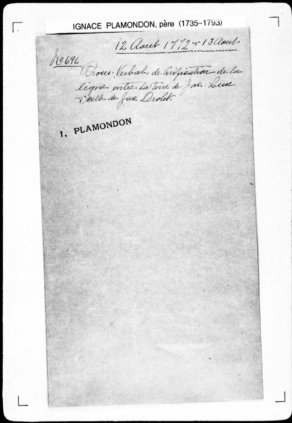 Procès-verbal de vérification d'une ligne séparant deux terres situées dans la paroisse de Saint-Étienne-de-Beaumont, seigneurie de Vincennes [seigneurie de Mont-à-Peine]. La présente pièce concerne directement: Jacques Lise dit Gourdeau (Lis, Lisse), habitant de Saint-Étienne-de-Beaumont; feu Jacques Drolet (arpenteur Ignace Plamondon père), 12 août 1772, Archives nationales à Québec, Fonds Cour supérieure. District judiciaire de Québec. Greffes d'arpenteurs, (03Q,CA301,S43,P696-1).
