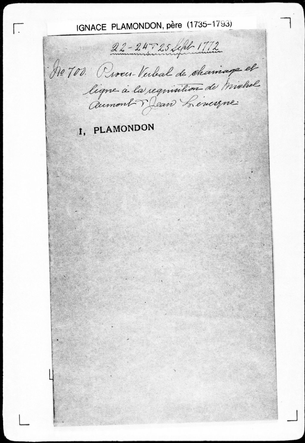Procès-verbal de vérification d'un procès-verbal de bornage d'une terre à partir de la borne qui fait la séparation des terres appartenant auparavant au sieur Legardeur de Gaspé d'avec le fief du sieur La Malotière d'Auteuil (arrière-fief de La Malotière), par ordre de la Cour des Plaidoyers communs du district de Québec donné à Sainte-Anne-du-Sud, laquelle terre étant bornée au sud-est par la petite rivière Saint-Jean, dans la [seigneurie de La Pocatière]., 24 septembre 1772, Archives nationales à Québec, Fonds Cour supérieure. District judiciaire de Québec. Greffes d'arpenteurs, (03Q,CA301,S43,P700-2).
