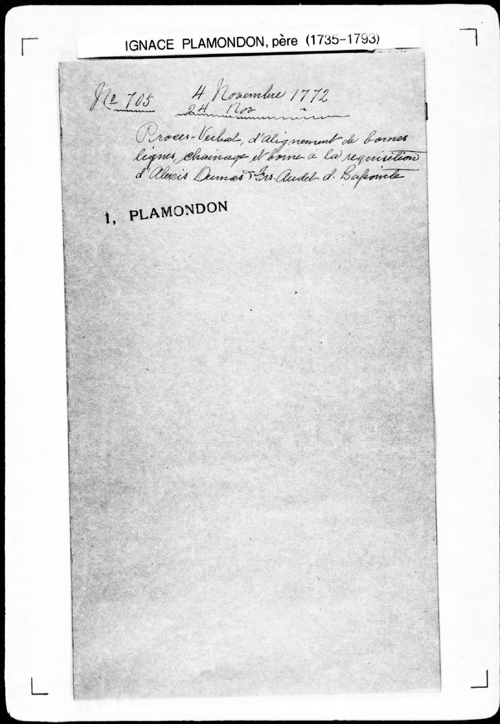 Procès-verbal de ligne et borne séparant deux terres depuis la borne de la grève jusqu'à environ le milieu de l'île d'Orléans, par ordre de la Cour des Plaidoyers communs du district de Québec en date du 2 octobre 1772, lesquelles terres étant situées à l'île d'Orléans, dans la paroisse de Saint-Laurent, seigneurie de l'Île-d'Orléans. La présente pièce concerne directement: Alexis Dumas; François Audet dit Lapointe (arpenteur Ignace Plamondon père), 4 novembre 1772, Archives nationales à Québec, Fonds Cour supérieure. District judiciaire de Québec. Greffes d'arpenteurs, (03Q,CA301,S43,P705-1).