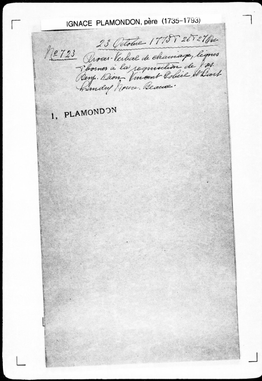 Procès-verbal de chaînage, lignes et bornes de trois terres, dont une non concédée, situées à la Nouvelle-Beauce, au nord-est de la rivière du saut de la Chaudière, dans la paroisse de Sainte-Marie, seigneurie de Sainte-Marie (Nouvelle-Beauce)., 26 octobre 1773, Archives nationales à Québec, Fonds Cour supérieure. District judiciaire de Québec. Greffes d'arpenteurs, (03Q,CA301,S43,P723-3).