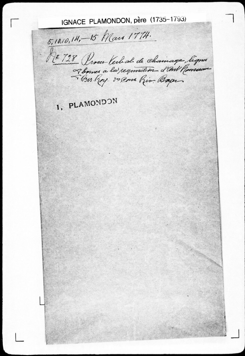 Procès-verbal de ligne et bornes séparant deux terres situées à la seconde concession, au sud-est de la rivière Boyer, dans la seigneurie de Livaudière. La présente pièce concerne directement: Eustache Plante; Antoine Morain (Morin) (arpenteur Ignace Plamondon père), 15 mars 1774, Archives nationales à Québec, Fonds Cour supérieure. District judiciaire de Québec. Greffes d'arpenteurs, (03Q,CA301,S43,P728-5).