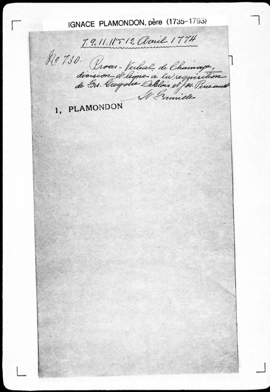Procès-verbal de bornes de trois terres situées [à l'île d'Orléans], dans la [seigneurie de l'Île-d'Orléans]. La présente pièce concerne directement: Joseph Perault (Perrault, Perreault); François Grégoire; Joseph Asselain (Asselin) (arpenteur Ignace Plamondon père), 11 avril 1774, Archives nationales à Québec, Fonds Cour supérieure. District judiciaire de Québec. Greffes d'arpenteurs, (03Q,CA301,S43,P730-4).