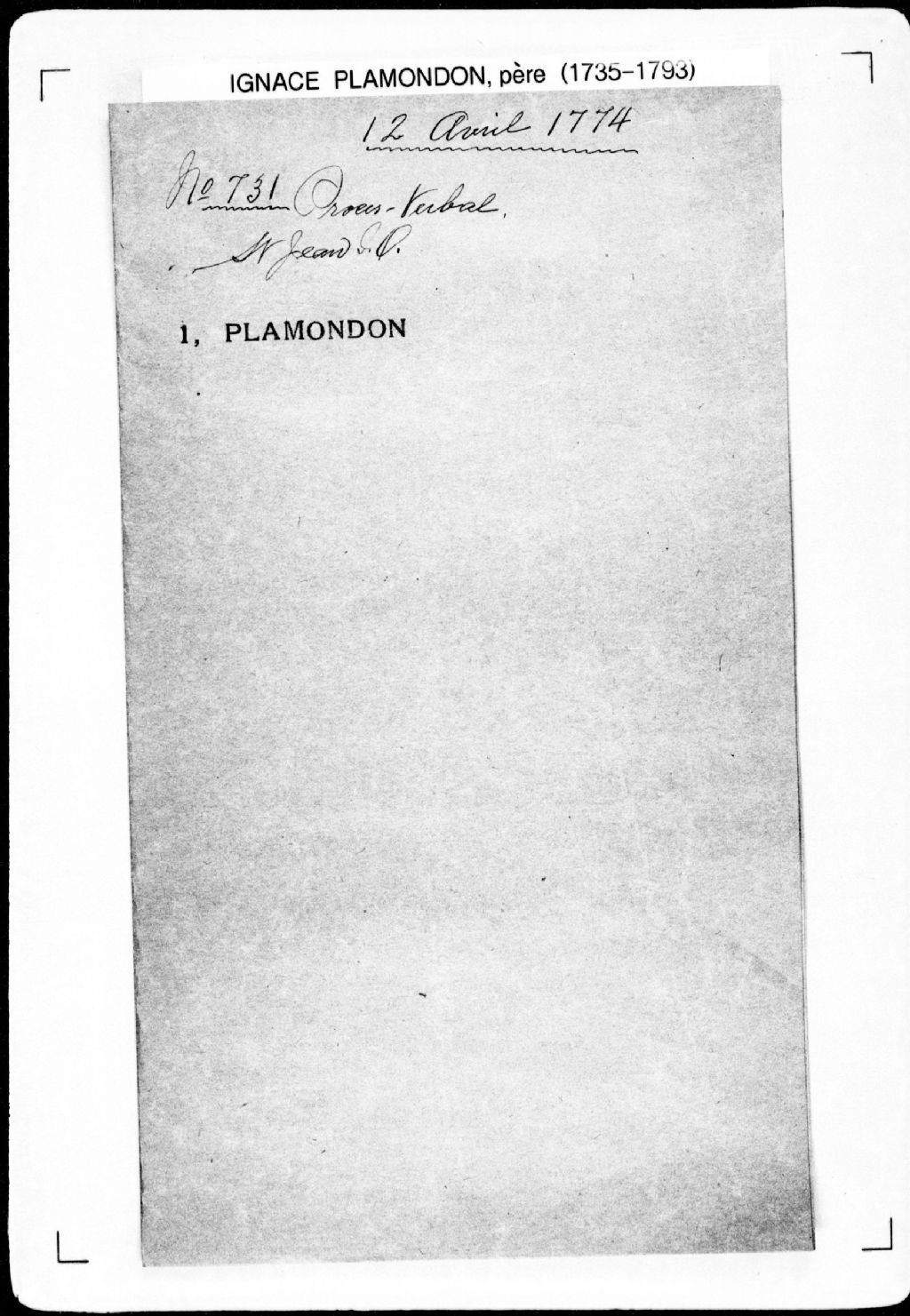 Mémoire des journées employées à l'arpentage de la seigneurie du Bic et de la seigneurie de Rimouski, au Bic, par ordre de la Cour des Plaidoyers communs du district de Québec en date du 6 octobre 1772 confirmé le 20 juillet 1773 (arpenteur Ignace Plamondon père), 20 janvier 1775, Archives nationales à Québec, Fonds Cour supérieure. District judiciaire de Québec. Greffes d'arpenteurs, (03Q,CA301,S43,P731-2).