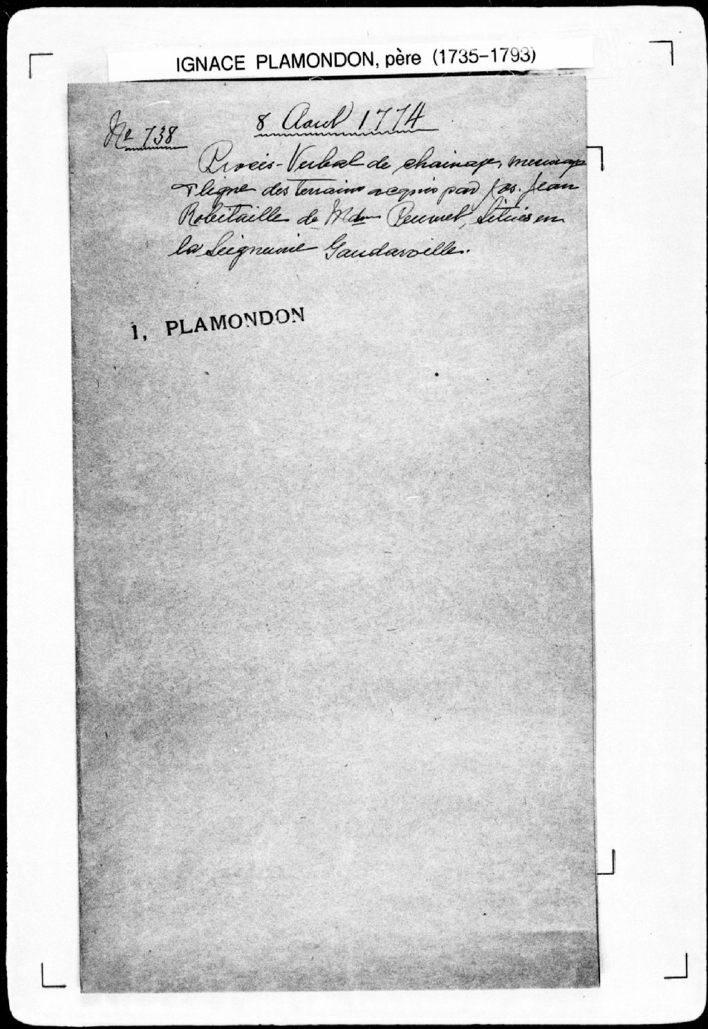 - La pièce se compose du procès-verbal et plan figuratif de chaînage d'une terre, de ligne la séparant d'avec le domaine seigneurial à commencer à la pointe du ruisseau des Prairies au lieu où il se décharge dans la rivière du Cap-Rouge et d'estimation du nombre d'épinettes coupées sur ledit domaine, lesquels terre et domaine étant situés dans la seigneurie de Gaudarville. Elle directement: Joseph-Jean Robitale (Robitaille), fils de feu Jean Robitaille; le domaine seigneurial; feue Marie-Anne Peuvret, de son vivant dame de Gaudarville et de Fossambault. Elle concerne indirectement des propriétaires voisins: feu Jean Robitale (Robitaille), père de Joseph-Jean Robitaille; feu Eustache Léonard Durbois dit Mondor (Liénard); Étienne Gauvin; Pierre Gauvin; le nommé Mondiche Mondor; les terres de la fabrique de Sainte-Foy.Le document comporte un procès-verbal et un plan des lots appartenant à Joseph Jean Robitaille situés dans la seigneurie de Gaudarville. Figurent sur ce dernier une partie de cette seigneurie et de la rivière du Cap Rouge, la dimension des lots, le domaine, le ruisseau, les terres de la fabrique ainsi que le noms Joseph Joseph, Pierre Gauvin, Jean Robitaille, Joseph Robitaille et Fabrique de Sainte-Foy.