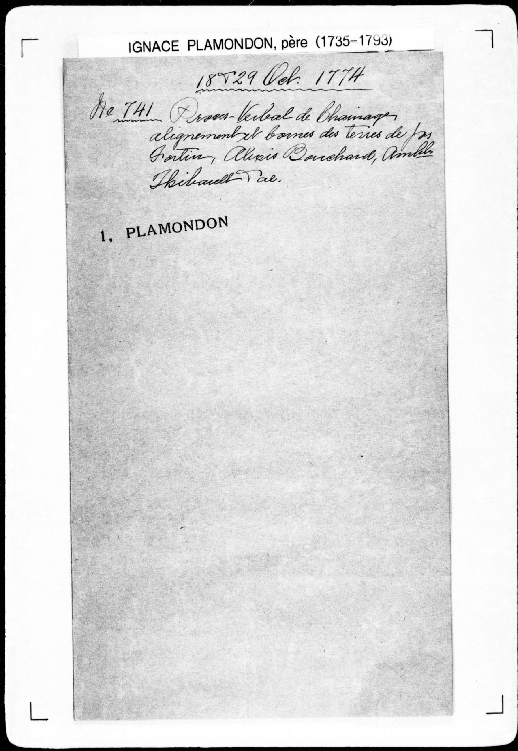 Procès-verbal de chaînage, lignes et bornes de six terres situées au nord-est de la rivière du Gouffre, à la Baie-Saint-Paul, dans la seigneurie de la Rivière-du-Gouffre. La présente pièce concerne directement: Antoine Gontier dit Larouche (Gonthier, Gauthier); René Belle (Bell, Bellay, Lebellay); Pierre Tramblet (Tremblay); Joseph Simard; François Simard (arpenteur Ignace Plamondon père), 29 octobre 1774, Archives nationales à Québec, Fonds Cour supérieure. District judiciaire de Québec. Greffes d'arpenteurs, (03Q,CA301,S43,P741-2).