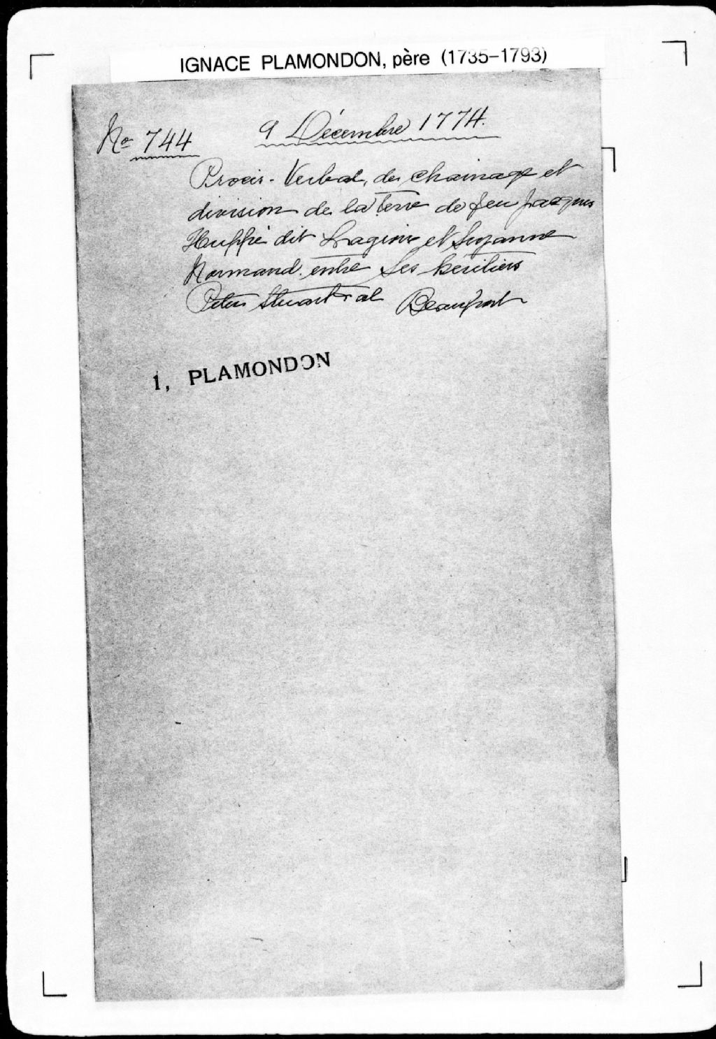 - Procès-verbal de partage de trois parties de terre et de chaînage, lignes et bornes des portions depuis le fleuve Saint-Laurent jusqu'aux environs du trait-carré de la commune, laquelle terre étant située au lieu nommé La Canardière, sur le fleuve Saint-Laurent, à la première concession, au nord-ouest des terres du Bourg-Royal (pour la troisième partie), dans la paroisse de Beauport, seigneurie de Notre-Dame-des-Anges.