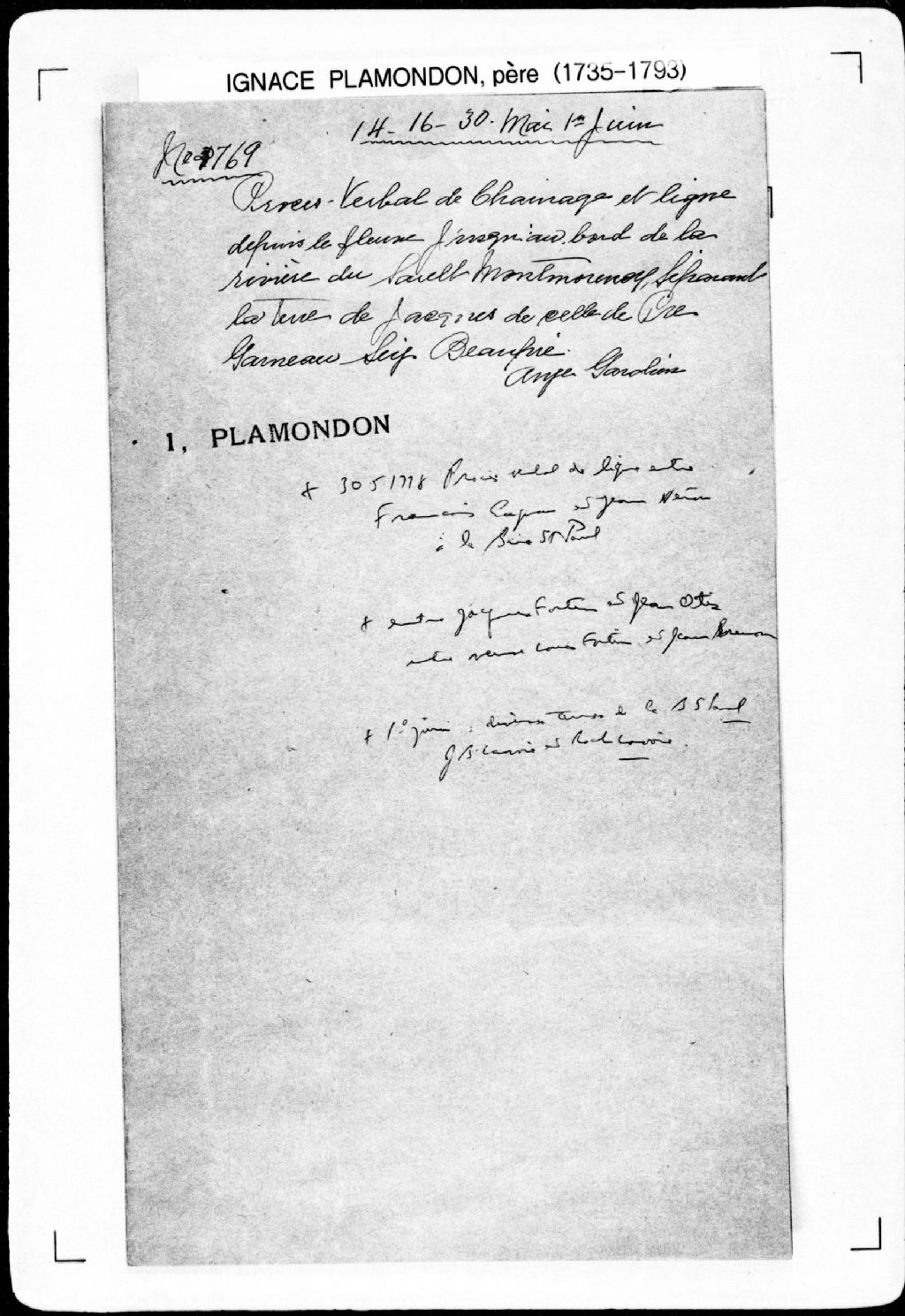 Procès-verbal de ligne et borne séparant deux terres situées dans la paroisse de Saint-Pierre-de-la-Baie-Saint-Paul, seigneurie de la Côte-de-Beaupré. La présente pièce concerne directement: François Gagnon; maître Jean Néron, notaire (arpenteur Ignace Plamondon père), 30 mai 1778, Archives nationales à Québec, Fonds Cour supérieure. District judiciaire de Québec. Greffes d'arpenteurs, (03Q,CA301,S43,P769-3).