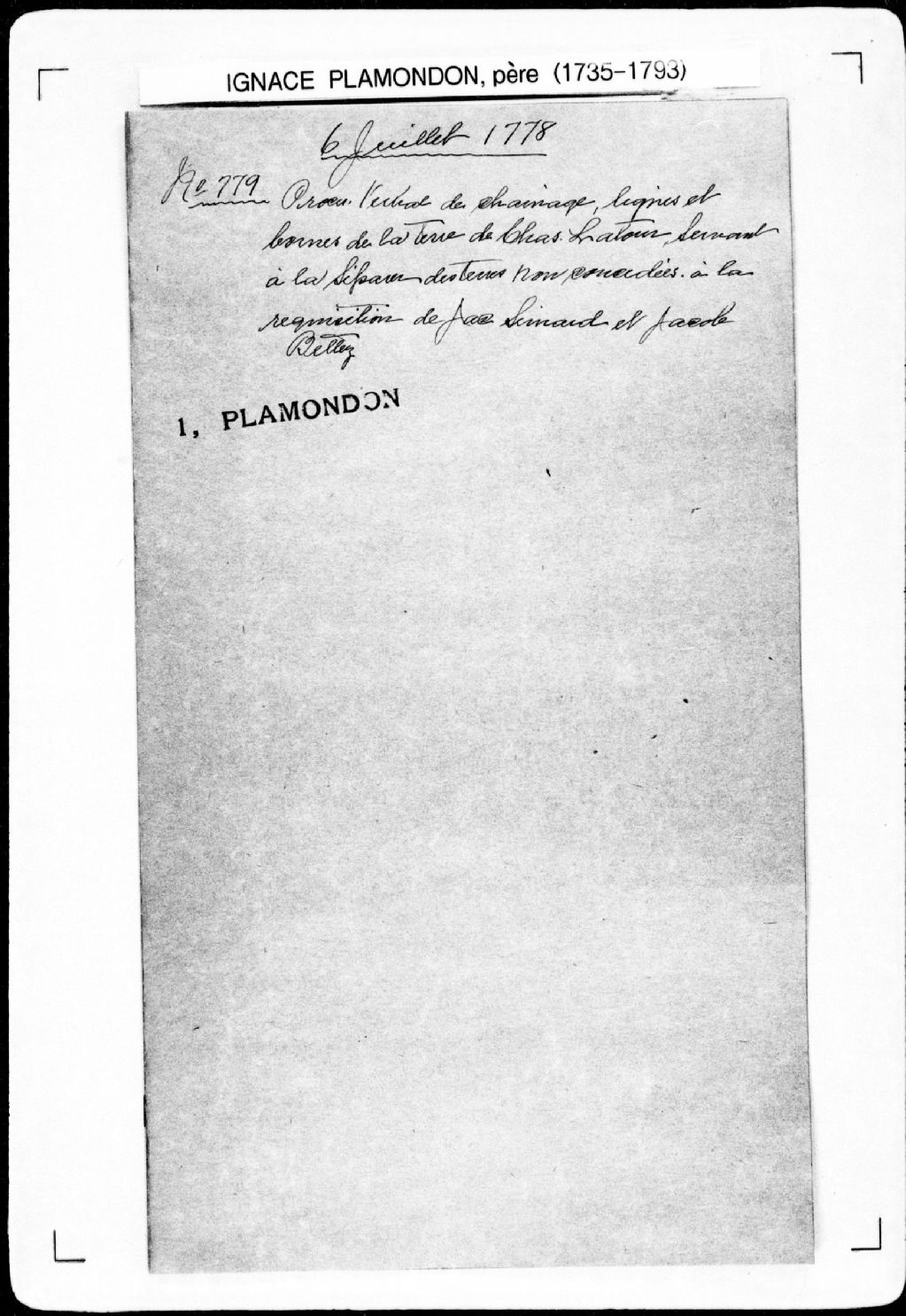 Procès-verbal de ligne et bornes séparant une terre d'avec les terres non concédées, lesquelles terres étant situées au lieu nommé le Raccourci, au nord-est de la rivière du Gouffre, dans la paroisse de Saint-Pierre-de-la-Baie-Saint-Paul, seigneurie de la Rivière-du-Gouffre. La présente pièce concerne directement: Charles Latour; Jacques Simard, seigneur primitif de la seigneurie de la Rivière-du-Gouffre (arpenteur Ignace Plamondon père), 6 juillet 1778, Archives nationales à Québec, Fonds Cour supérieure. District judiciaire de Québec. Greffes d'arpenteurs, (03Q,CA301,S43,P779).
