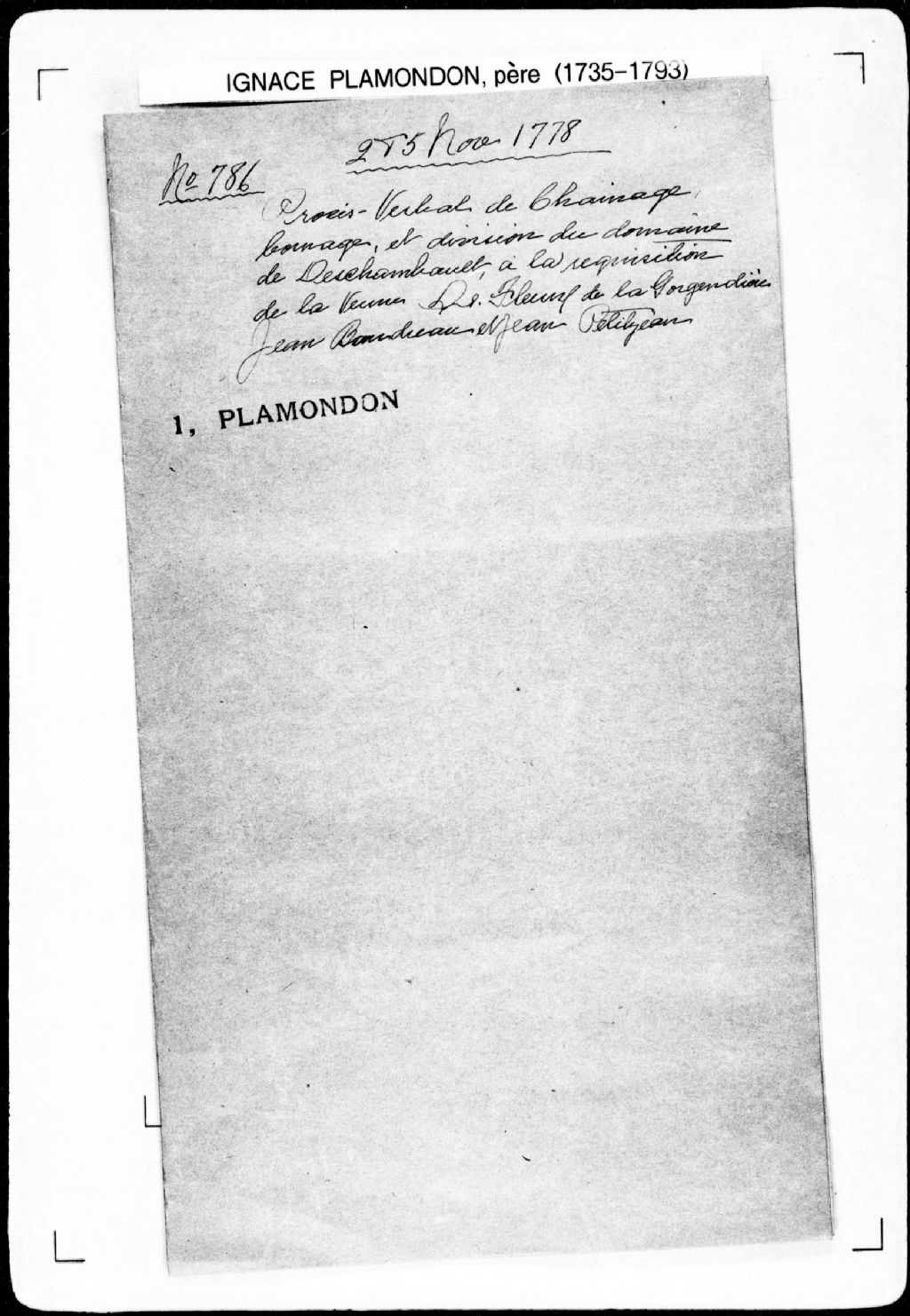 - Procès-verbal de partage et division du domaine seigneurial et de chaînage, lignes et bornes des portions, lequel domaine étant situé à la première concession, sur le fleuve Saint-Laurent, au sud-est du chemin Royal, dans la seigneurie de Deschambault.