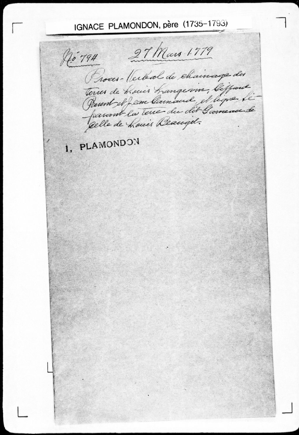Procès-verbal de chaînage et ligne de quatre terres depuis la ceinture de la seconde concession jusqu'à la rivière du saut Montmorency, lesquelles terres étant situées à la troisième concession, dans la paroisse de L'Ange-Gardien, seigneurie de la Côte-de-Beaupré. La présente pièce concerne directement: Louis Langevin; Gifard (Lifard, Richard) Parant (Parent); Jean Garnaud (Garneau); Louis Beaugit (Beaugis, Baugis) (arpenteur Ignace Plamondon père), 27 mars 1779, Archives nationales à Québec, Fonds Cour supérieure. District judiciaire de Québec. Greffes d'arpenteurs, (03Q,CA301,S43,P794).