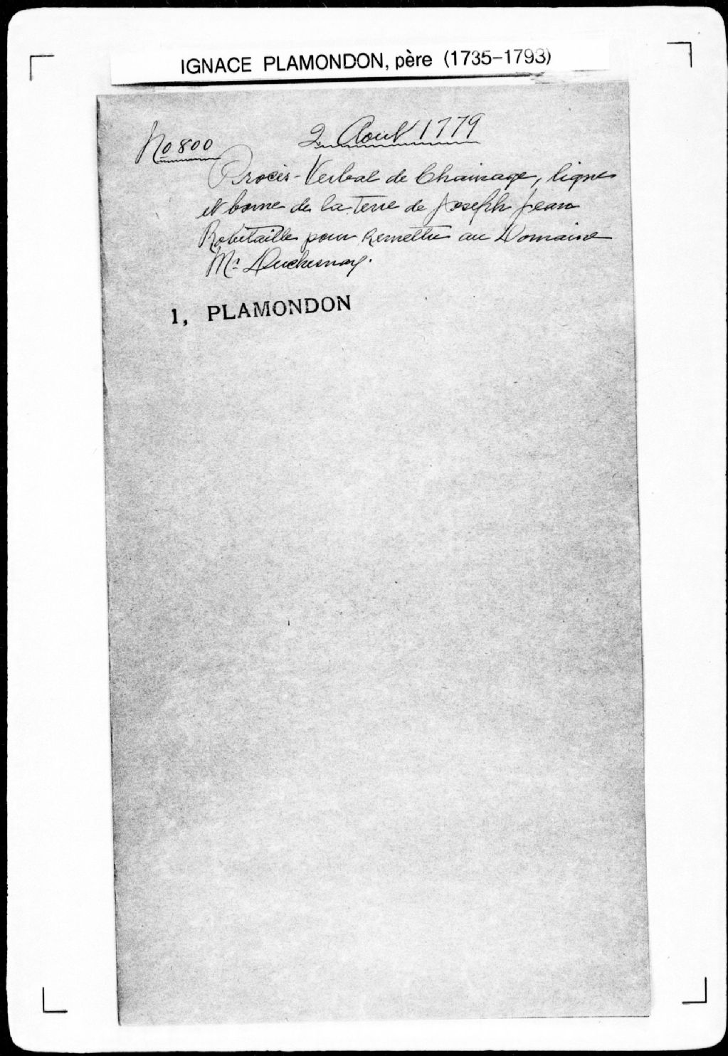 Procès-verbal de chaînage d'une pièce de terre bornée sur les trois faces par la rivière du Cap-Rouge, dans la [seigneurie de Gaudarville]. La présente pièce concerne directement: Joseph-Jean Robitaille, père de Joseph Robitaille et cousin de Joseph Robitaille (arpenteur Ignace Plamondon père), 2 août 1779, Archives nationales à Québec, Fonds Cour supérieure. District judiciaire de Québec. Greffes d'arpenteurs, (03Q,CA301,S43,P800-2).