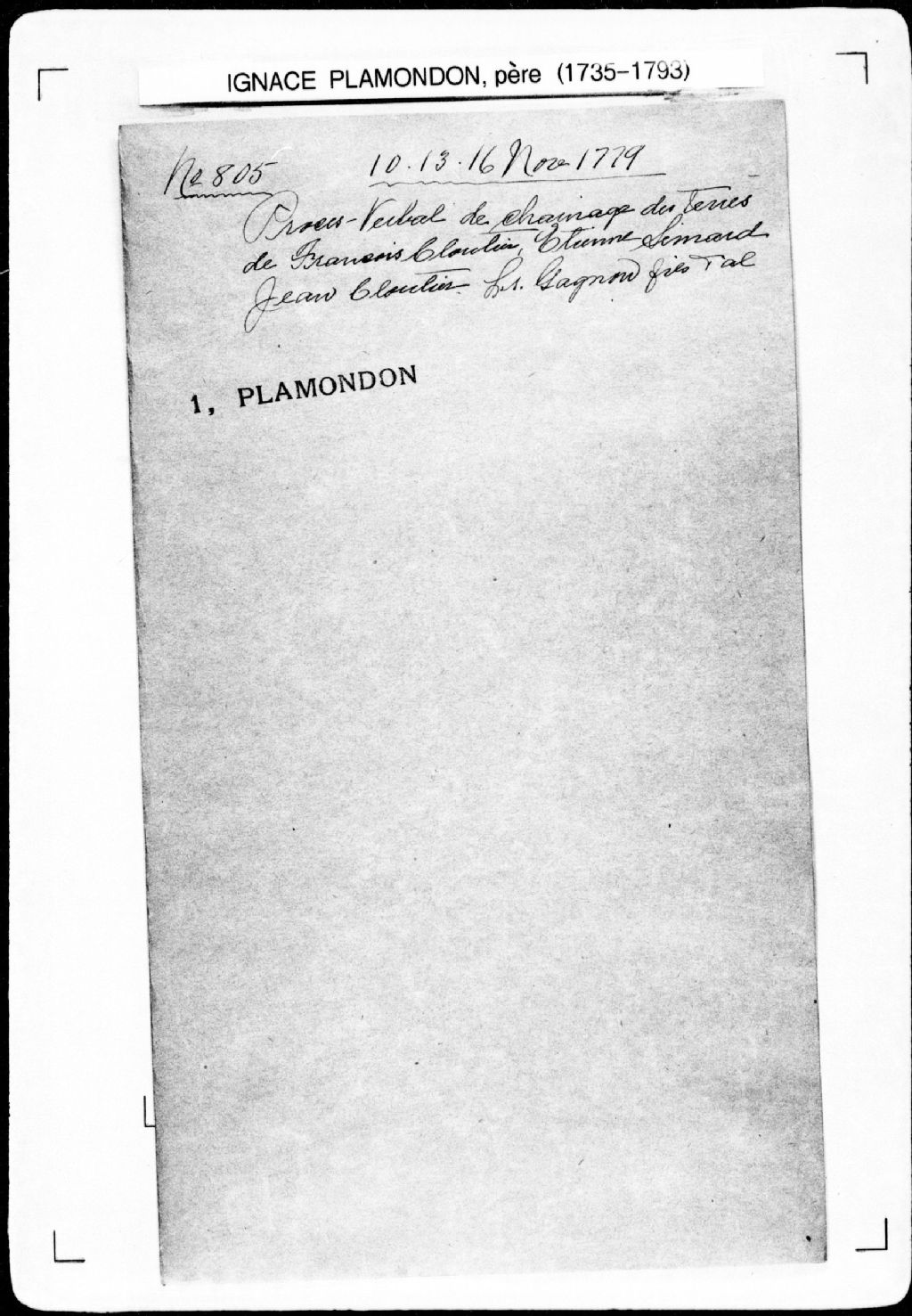 Procès-verbal de chaînage et ligne de six terres situées dans la paroisse du Château-Richer, seigneurie de la Côte-de-Beaupré. La présente pièce concerne directement: François Cloutier; Étienne Simard; Jean Cloutier; Louis Gagnon, fils de Louis Gagnon; Louis Gagnon, père de Louis Gagnon; Charles Lefrançois (arpenteur Ignace Plamondon père), 10 novembre 1779, Archives nationales à Québec, Fonds Cour supérieure. District judiciaire de Québec. Greffes d'arpenteurs, (03Q,CA301,S43,P805-1).