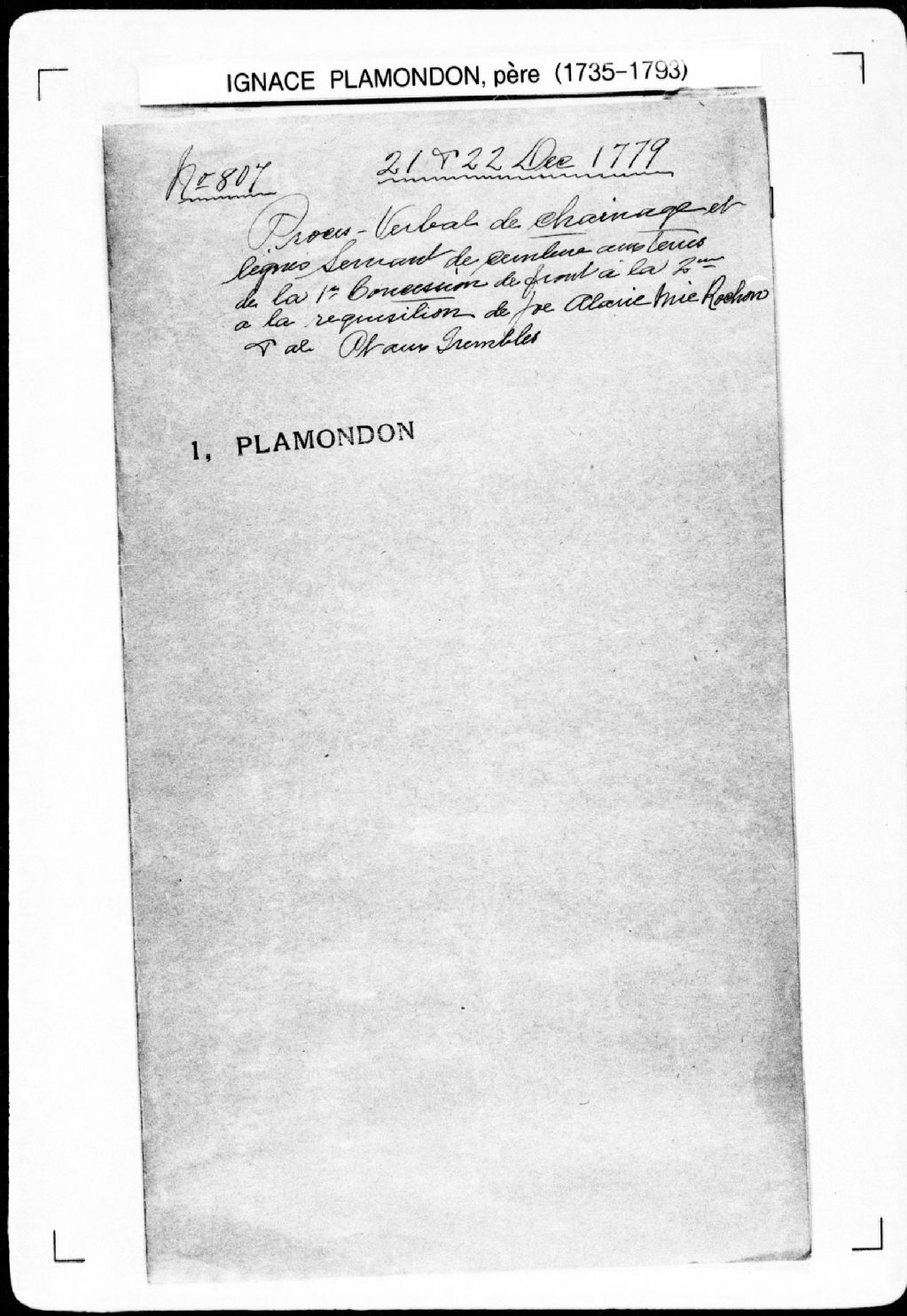 Procès-verbal de chaînage, ligne et bornes de la profondeur de deux terres depuis le fleuve Saint-Laurent jusqu'à la profondeur, laquelle ligne pour servir de ceinture aux terres de la première concession et de front aux terres de la seconde concession, lesquelles terres étant situées à la première concession (pour Michel Loriot et Gabriel Trudel) sur le fleuve Saint-Laurent, et à la seconde concession, dans la paroisse de Saint-François-de-Sales-de-la-Pointe-aux-Trembles, seigneurie de Neuville, 21 décembre 1779, Archives nationales à Québec, Fonds Cour supérieure. District judiciaire de Québec. Greffes d'arpenteurs, (03Q,CA301,S43,P807-1).