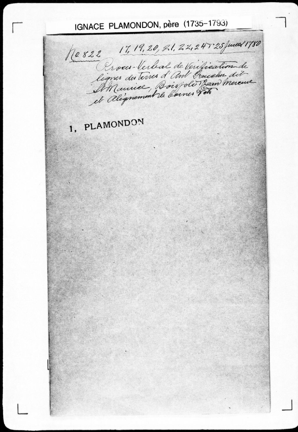 Procès-verbal de ligne et bornes séparant des terres situées à la deuxième concession, au bout des quarante arpents du fleuve Saint-Laurent, dans la seigneurie de Neuville. La présente pièce concerne directement: Jean Boisjolie (Boisjoli, Boisjoly); Jean Dubuc; Louis Bernard; les représentants de feu Noël Peltier (Pelletier) (arpenteur Ignace Plamondon père), 20 juillet 1780, Archives nationales à Québec, Fonds Cour supérieure. District judiciaire de Québec. Greffes d'arpenteurs, (03Q,CA301,S43,P822-3).