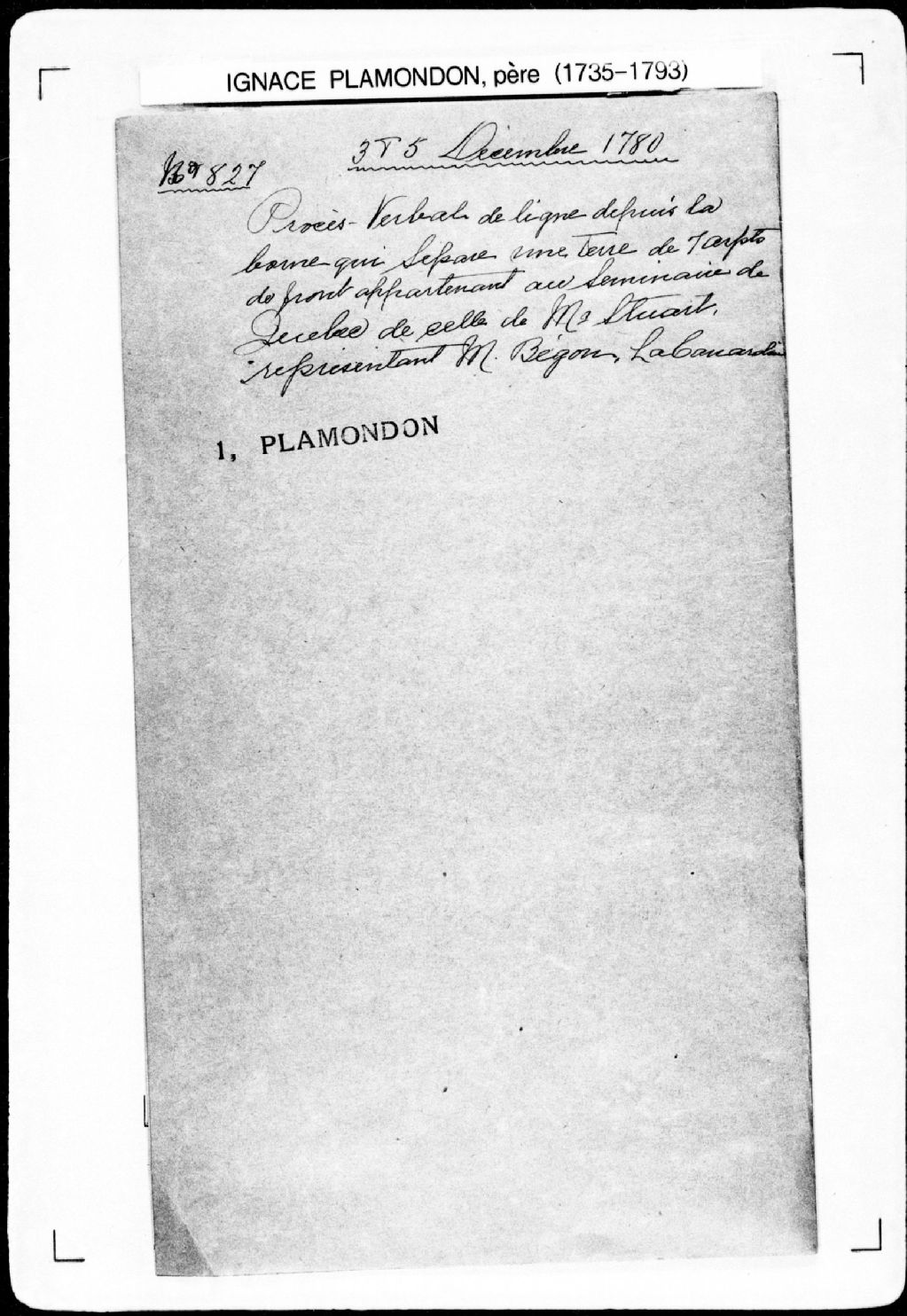 Procès-verbal de ligne séparant deux terres situées à La Canardière, dans la seigneurie de Notre-Dame-des-Anges. La présente pièce concerne directement: le sieur Staure (Stuart), représentant du feu sieur Bégon, ancien intendant de la Nouvelle-France; le Séminaire des Missions étrangères établi à Québec (arpenteur Ignace Plamondon père), 3 décembre 1780 - 4 décembre 1780, Archives nationales à Québec, Fonds Cour supérieure. District judiciaire de Québec. Greffes d'arpenteurs, (03Q,CA301,S43,P827-1).