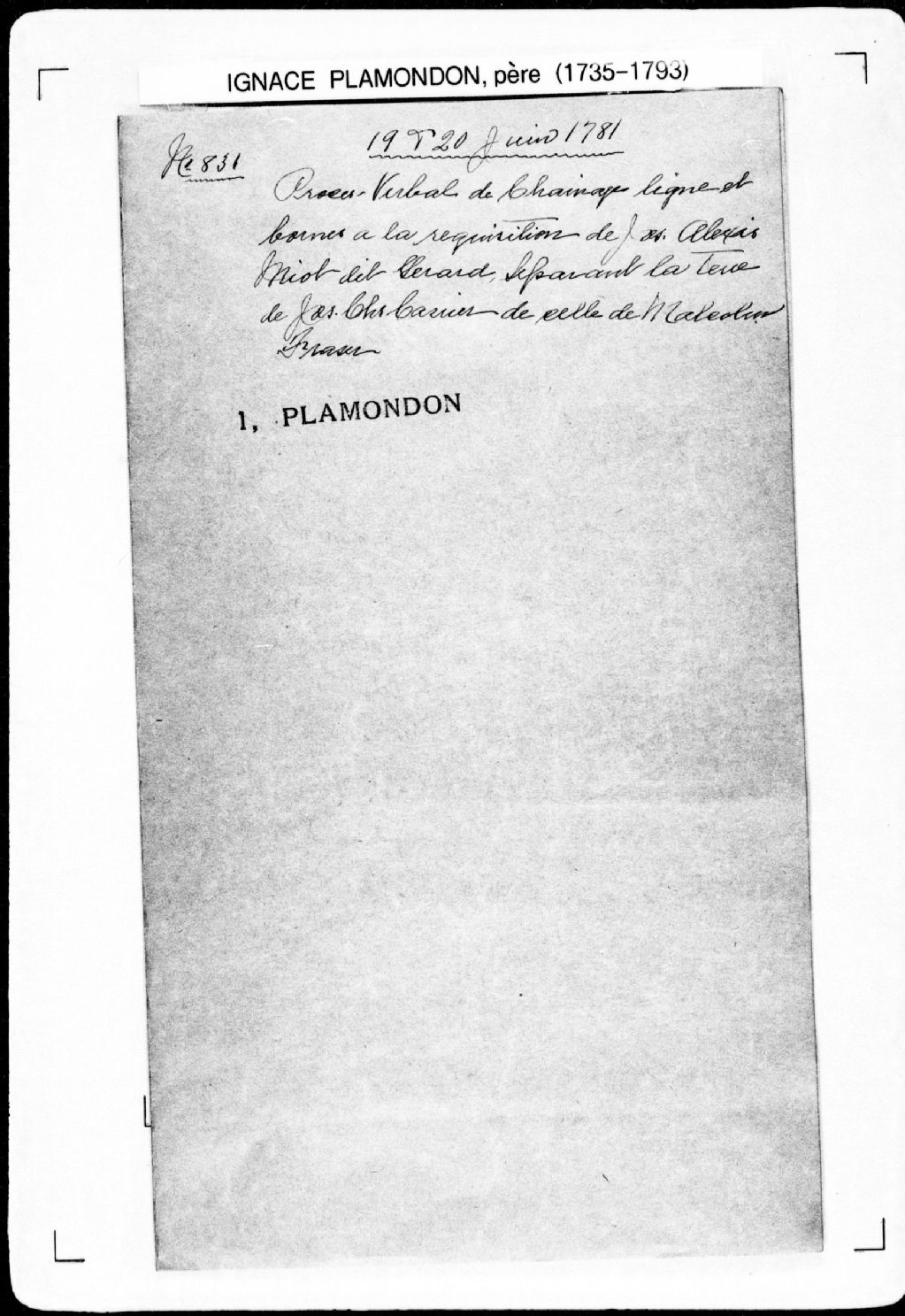Procès-verbal de ligne et bornes séparant deux terres situées à la première concession, sur la grève, dans la paroisse de Saint-Étienne, seigneurie de Beaumont. La présente pièce concerne directement: Joseph-Charles Carie (Carrier); Malcolm Frasert (Fraser) (arpenteur Ignace Plamondon père), 19 juin 1781, Archives nationales à Québec, Fonds Cour supérieure. District judiciaire de Québec. Greffes d'arpenteurs, (03Q,CA301,S43,P831-1).