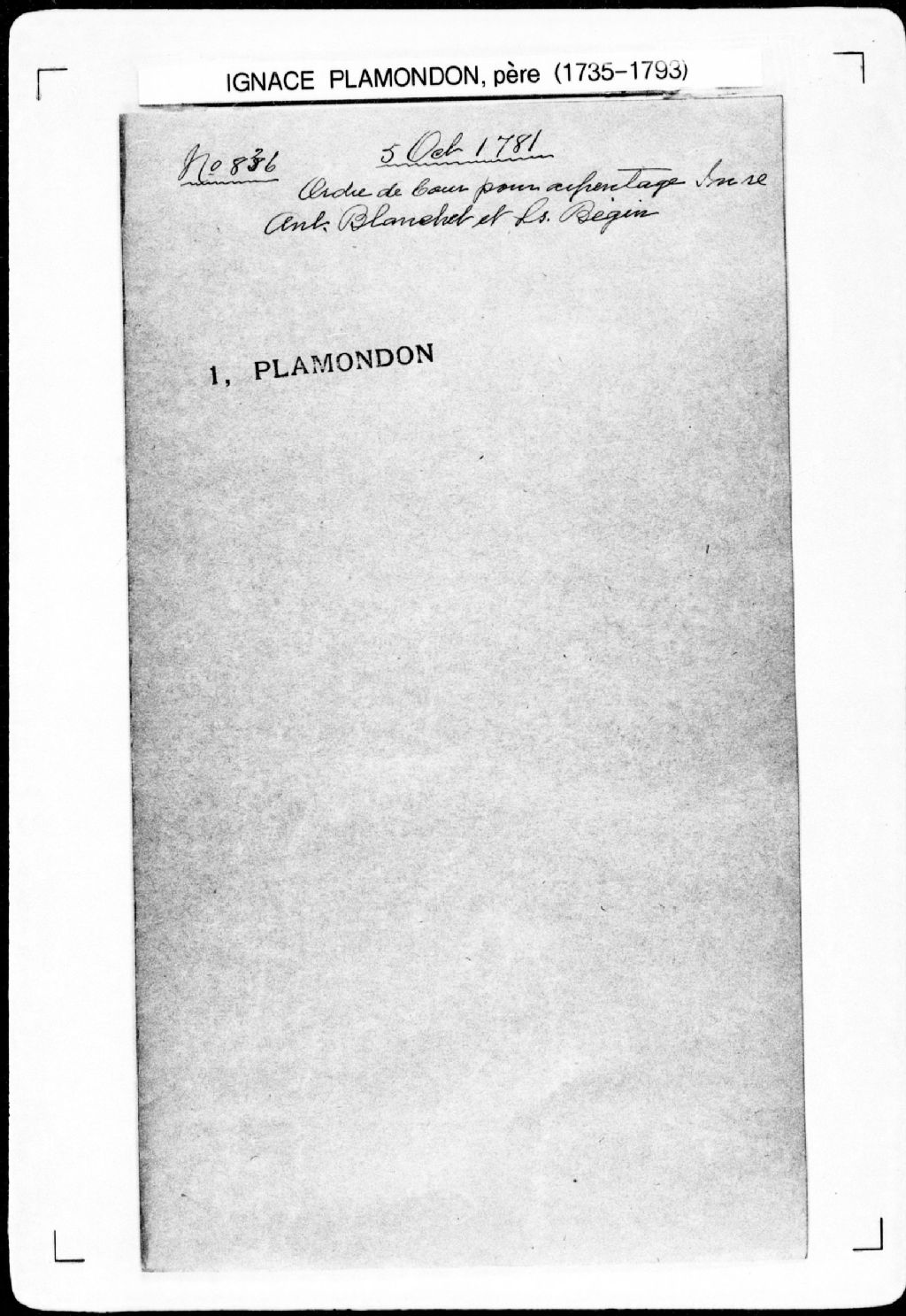 Ordre de la Cour de semaine tenante quant à la nomination de l'arpenteur Ignace Plamondon fils, à défaut de son père, à l'effet de prolonger la ligne de séparation entre deux terres et d'en dresser un procès-verbal et un plan figuratif, lesquelles terres étant situées dans la seigneurie de Lauzon. La présente pièce concerne directement: Antoine Blanchet; Louis Bégin (arpenteurs Ignace Plamondon père et Ignace Plamondon fils), 5 octobre 1781, Archives nationales à Québec, Fonds Cour supérieure. District judiciaire de Québec. Greffes d'arpenteurs, (03Q,CA301,S43,P836).