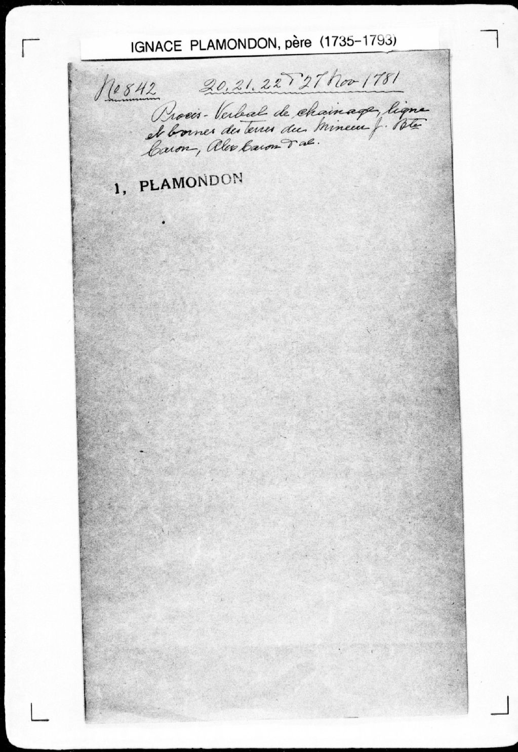 Procès-verbal de chaînage, lignes et bornes de trois terres situées à la troisième concession, dans la paroisse Saint-Roch, seigneurie de Saint-Denis. La présente pièce concerne directement: Gabriel Peltier (Pelletier); Joseph Peltier (Pelletier); Gabriel Thibault (arpenteur Ignace Plamondon père), 27 novembre 1781, Archives nationales à Québec, Fonds Cour supérieure. District judiciaire de Québec. Greffes d'arpenteurs, (03Q,CA301,S43,P842-4).