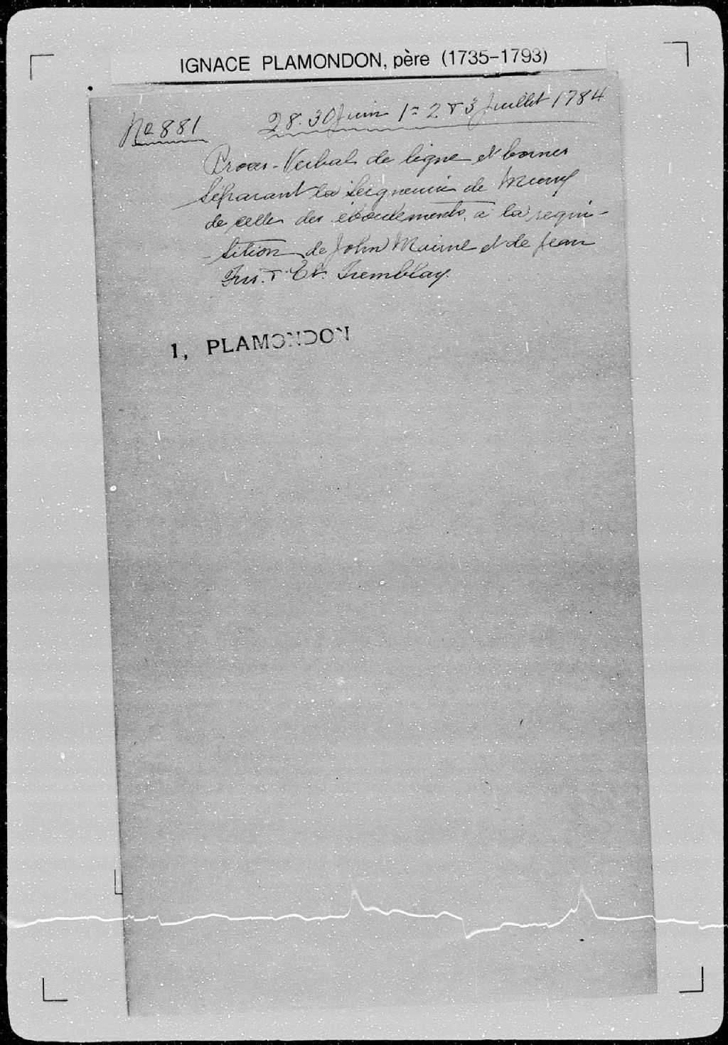 Procès-verbal de ligne et bornes séparant deux terres situées au nord-est de la rivière Murray-Bay (Malbaie), dans la seigneurie de Murray-Bay (dite La Malbaie). La présente pièce concerne directement: Jean Simard (fils); Jean-Noël Simard (arpenteur Ignace Plamondon père), 28 juin 1784, Archives nationales à Québec, Fonds Cour supérieure. District judiciaire de Québec. Greffes d'arpenteurs, (03Q,CA301,S43,P881-1).