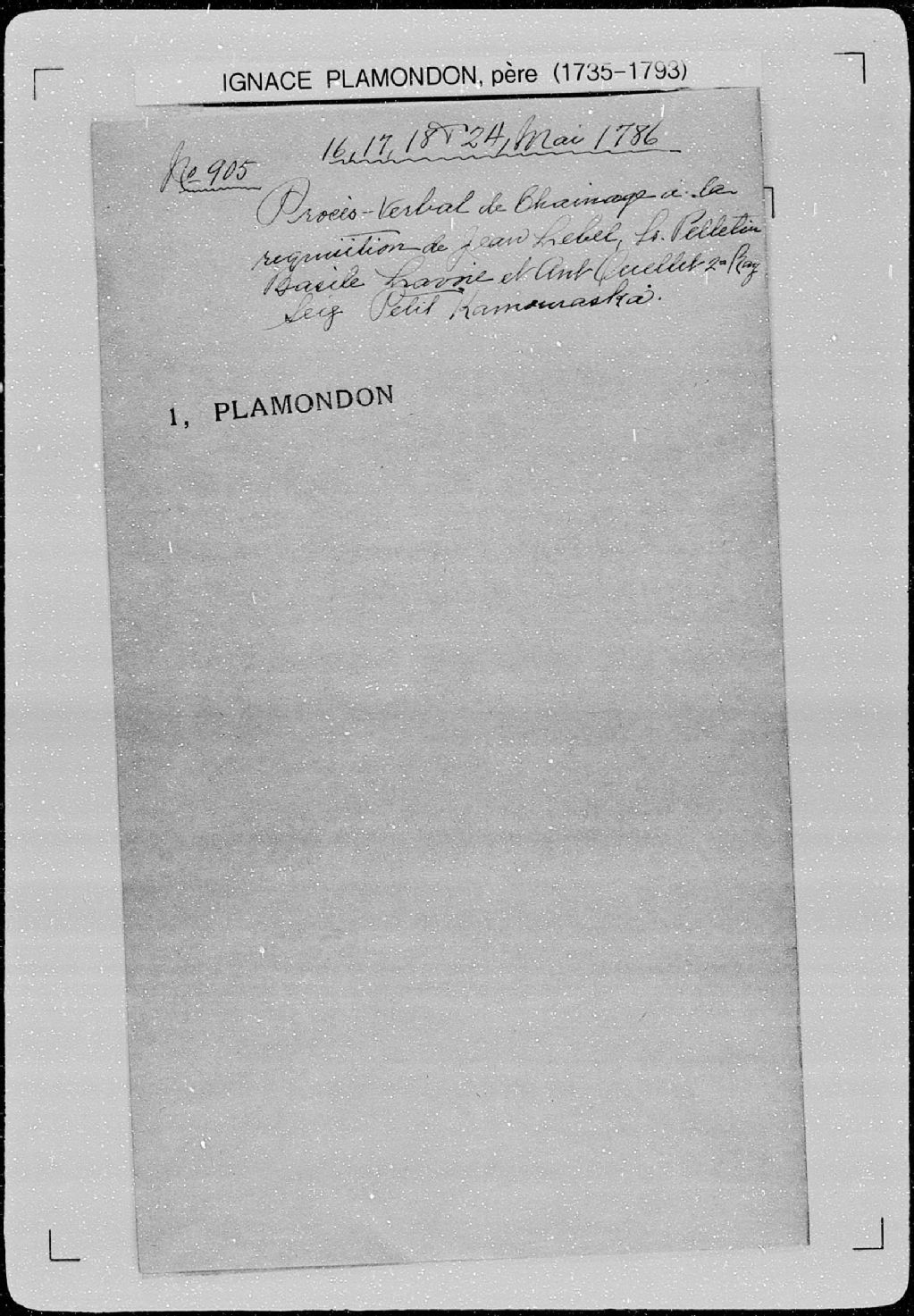 Procès-verbal de chaînage de quatre terres situées à la deuxième concession, dans la seigneurie de Kamouraska. La présente pièce concerne directement: Joseph Marcquy (Marquis); Michel Délorie (Deslauriers); Charles Mignot dit Labrie (Mignault); le sieur Saint-Jorre dit Sargit (Saint-Jor dit Sergerie); Jean-Charles Gagnon (arpenteur Ignace Plamondon père), 24 mai 1786, Archives nationales à Québec, Fonds Cour supérieure. District judiciaire de Québec. Greffes d'arpenteurs, (03Q,CA301,S43,P905-1).