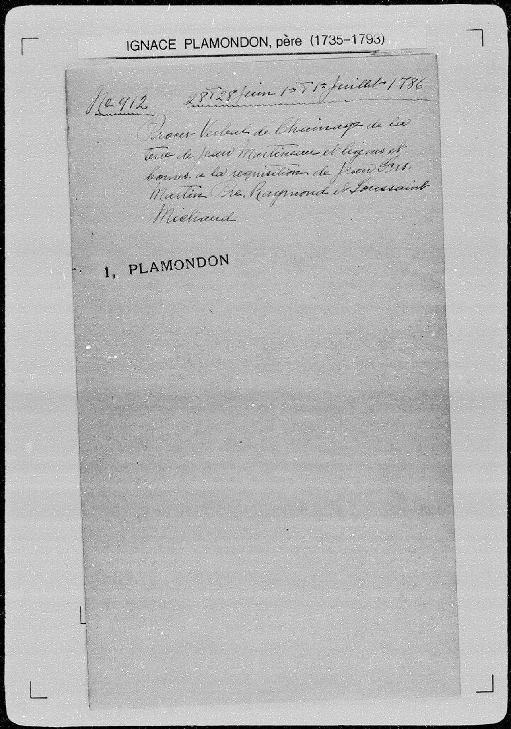 Procès-verbal de chaînage, lignes et bornes de terres situées à la quatrième concession, dans la seigneurie de Saint-Denis-[de-la-Bouteillerie]. La présente pièce concerne directement: Pierre Bérubé; Bénoni Peltier (Pelletier); Louis Peltier (Pelletier); Louis-Marie Caron; Joseph-Marie Caron (arpenteur Ignace Plamondon père), 1er juillet 1786, Archives nationales à Québec, Fonds Cour supérieure. District judiciaire de Québec. Greffes d'arpenteurs, (03Q,CA301,S43,P912-3).
