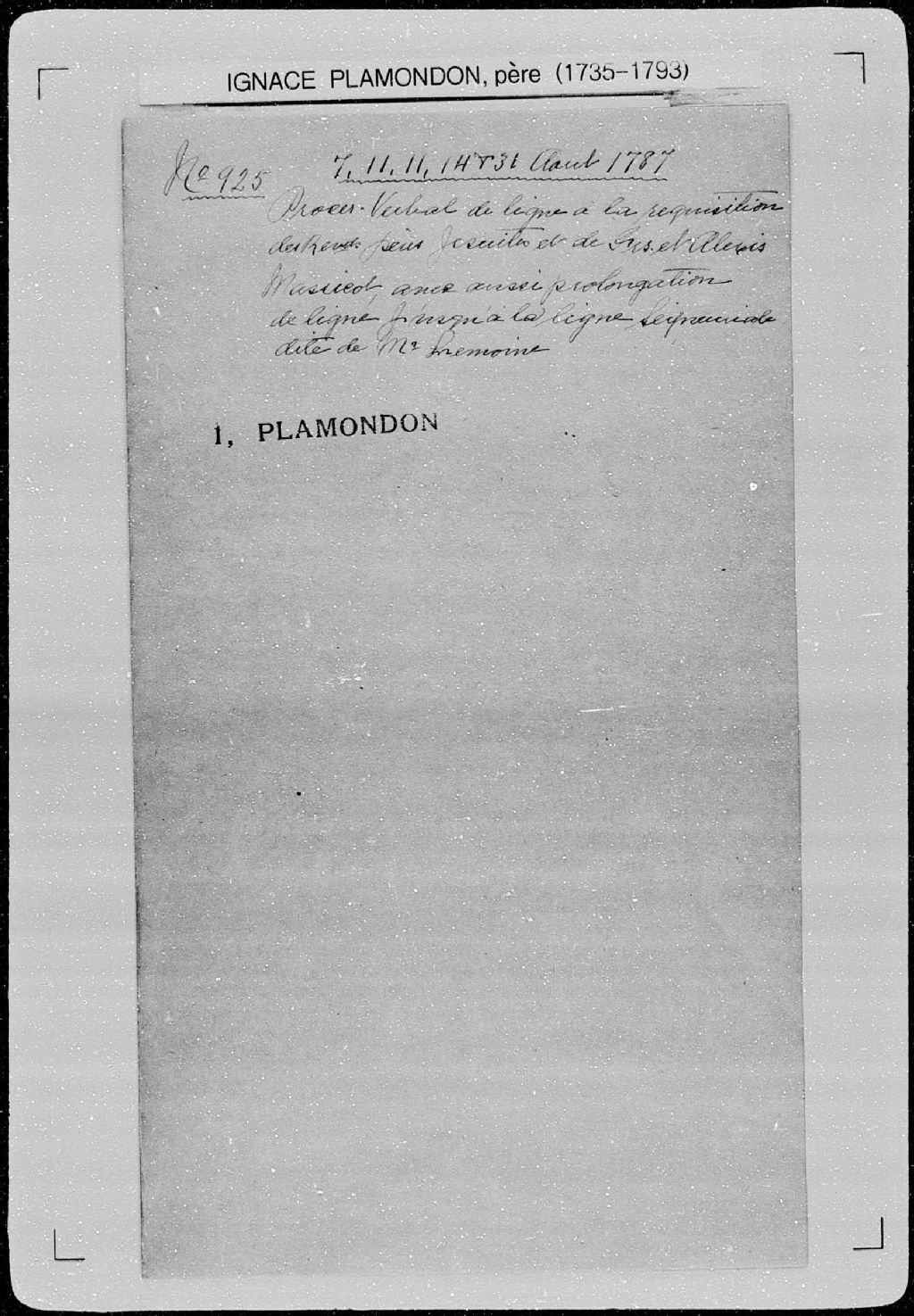 Procès-verbal de ligne et bornes séparant deux terres situées à l'est de la rivière Batiscan, dans la seigneurie de Batiscan. La présente pièce concerne directement: Joseph Lafontaine; François Gervais (arpenteur Ignace Plamondon père), 11 août 1787, Archives nationales à Québec, Fonds Cour supérieure. District judiciaire de Québec. Greffes d'arpenteurs, (03Q,CA301,S43,P925-3).