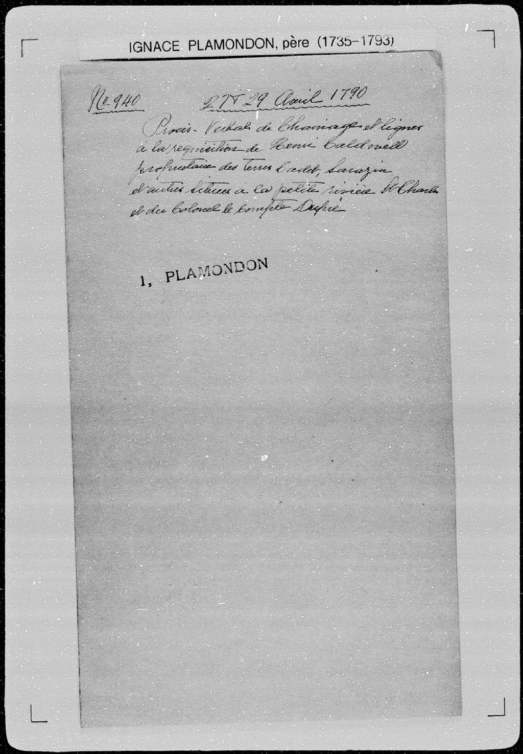 - Extrait des titres de concession et d'acquisition de deux terres situées depuis le coteau Sainte-Geneviève allant à la rivière Saint-Charles. La présente pièce concerne directement: le sieur Leconte Dupré (Lecomte); le sieur Caldouel (Caldwell) (arpenteur Ignace Plamondon père)