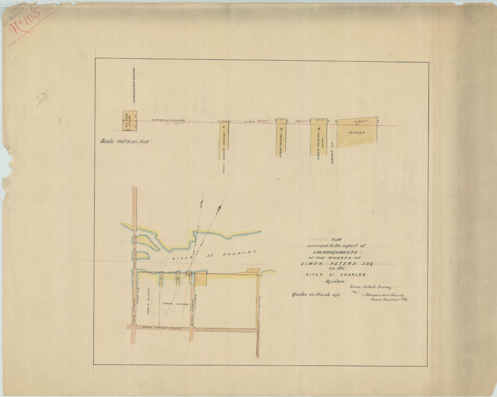 Plan of encroachments of wharfs of Simon Peters esq. on the River St.Charles, Quebec