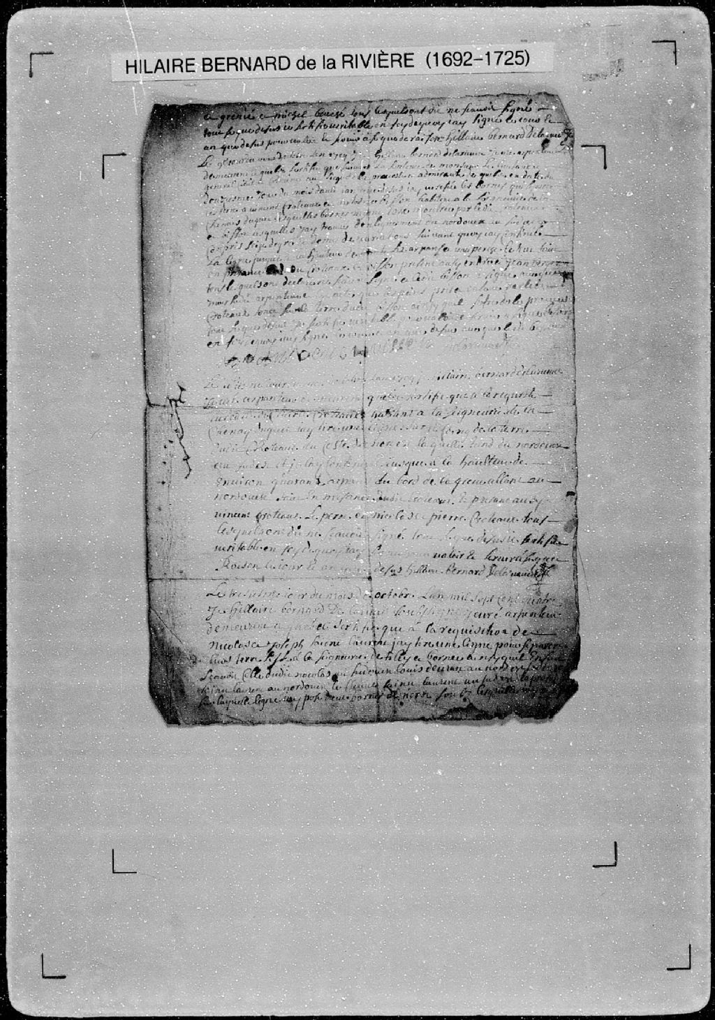 Procès-verbal de ligne d'une terre située dans le fief la Chesnaye Duquet, [seigneurie Duquet]. La présente pièce concerne directement: Charles Croteaux (Croteau), habitant à la seigneurie de la Chesnaye Duquet (arpenteur Hilaire Bernard de Larivière)