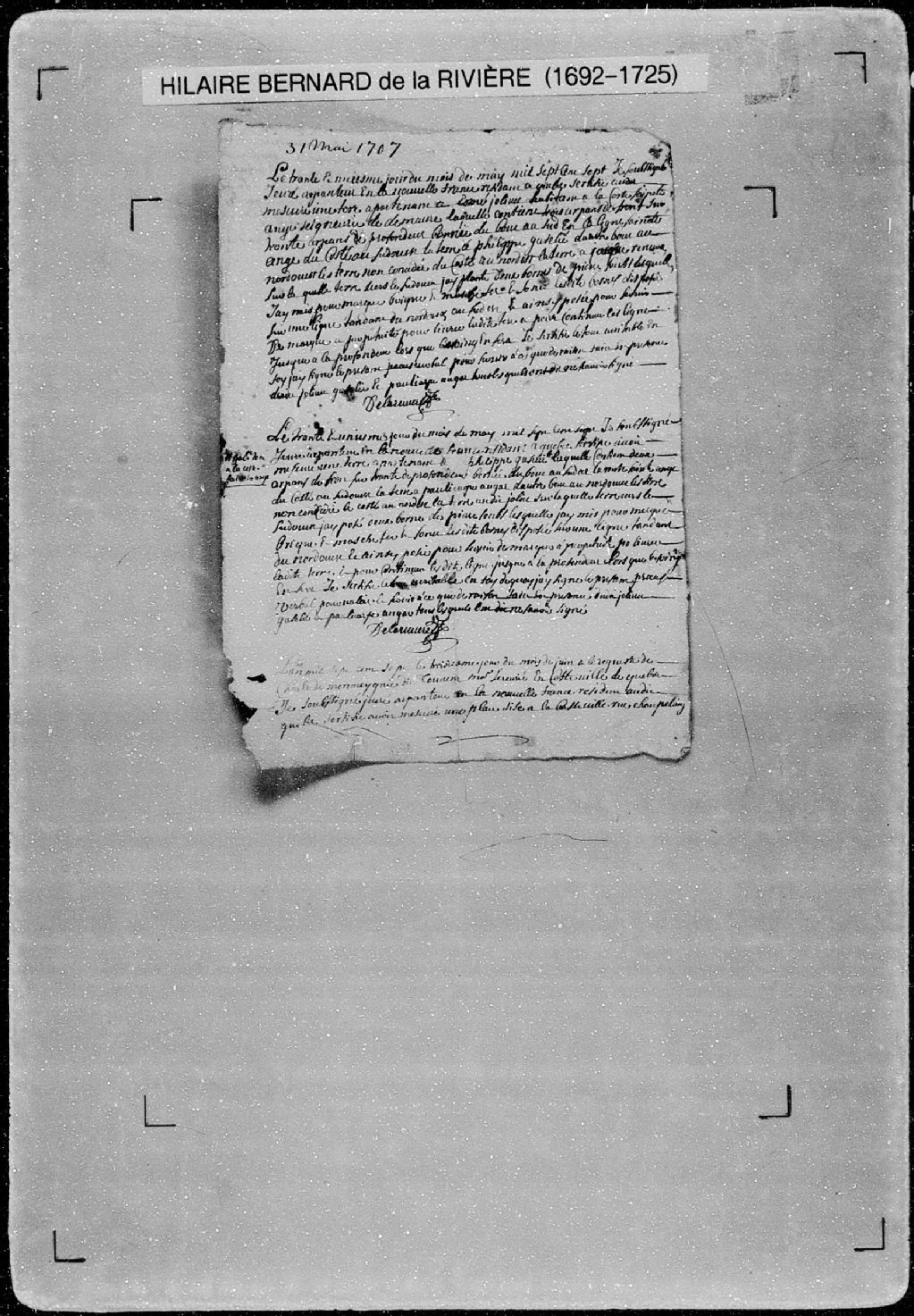 Procès-verbal de chaînage d'un emplacement situé rue Champlain, sur la petite rue qui descend à la grève, dans la ville de Québec. La présente pièce concerne directement: Charles de Monmeygnie dit Touvent (Montminy, Monmainier, Montmesnil dit Jouvent), maître serrurier de Québec (arpenteur Hilaire Bernard de Larivière)