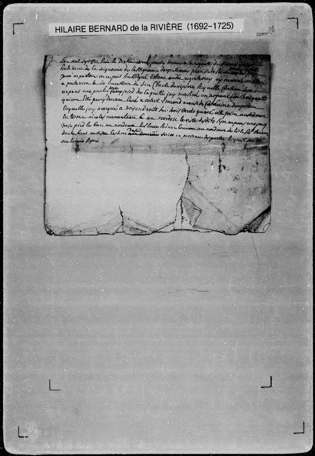 Procès-verbal de chaînage d'une terre située au nord-ouest de l'île Saint-Laurent (île d'Orléans), sur le fleuve Saint-Laurent, paroisse de Saint-François-de-Sales, dans l'[arrière-fief d']Argentenay de la seigneurie de l'Île-d'Orléans. La présente pièce concerne directement: Robert Esmond (Émond), mari de Catherine Dompierre et gendre de feu Charles Dompierre (arpenteur Hilaire Bernard de Larivière), 18 février 1708, Archives nationales à Québec, Fonds Cour supérieure. District judiciaire de Québec. Greffes d'arpenteurs, (03Q,CA301,S56,P165).