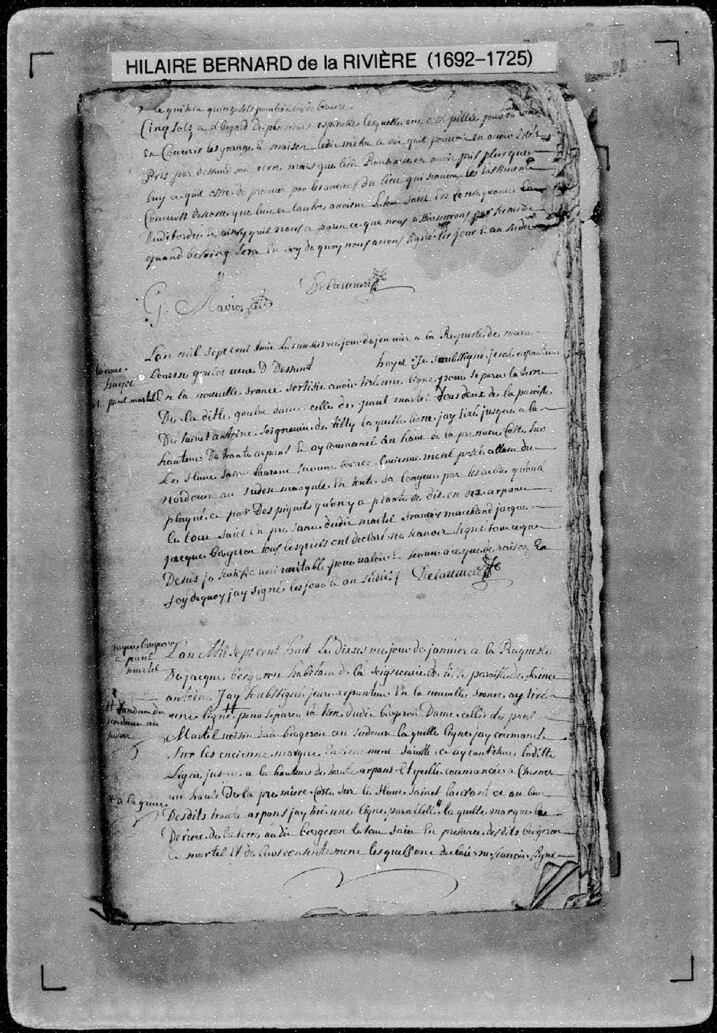Procès-verbal de ligne et bornes séparant deux terres et de ligne de la profondeur d'une des terres, lesquelles terres étant situées sur le fleuve Saint-Laurent, dans la paroisse de Saint-Antoine, seigneurie de Tilly. La présente pièce concerne directement: Jacques Bergeron, habitant de la seigneurie de Tilly, paroisse de Saint-Antoine; Paul Martel (arpenteur Hilaire Bernard de Larivière), 10 janvier 1708, Archives nationales à Québec, Fonds Cour supérieure. District judiciaire de Québec. Greffes d'arpenteurs, (03Q,CA301,S56,P203).