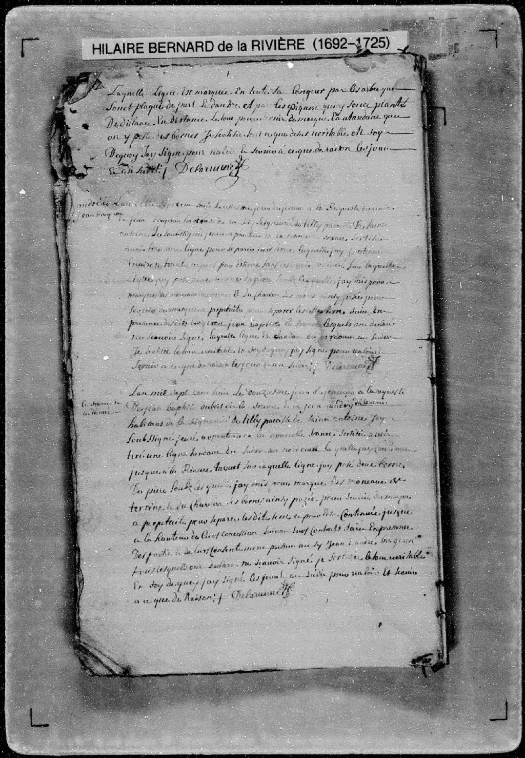 Procès-verbal de ligne et bornes séparant deux terres situées dans la paroisse de Saint-Antoine, seigneurie de Tilly. La présente pièce concerne directement: André Bergeron, habitant de la seigneurie de Tilly, paroisse de Saint-Antoine; Jean Bergeron, habitant de la seigneurie de Tilly, paroisse de Saint-Antoine (arpenteur Hilaire Bernard de Larivière), 11 janvier 1708, Archives nationales à Québec, Fonds Cour supérieure. District judiciaire de Québec. Greffes d'arpenteurs, (03Q,CA301,S56,P204).