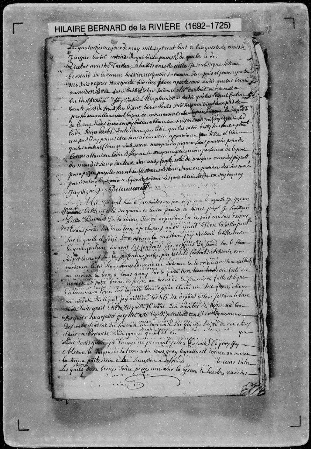 Procès-verbal de chaînage d'un emplacement et de bornes le séparant d'avec l'emplacement voisin, lequel emplacement étant situé rue Saint-Louis et rue du Mont-Carmel dans la [Haute-Ville de Québec]. La présente pièce concerne directement: Jacques Barbel, notaire royal en la Prévôté de Québec; le nommé Quelas (Quesla, Quayla), maître tailleur d'habits de Québec (arpenteur Hilaire Bernard de Larivière), 14 mai 1708, Archives nationales à Québec, Fonds Cour supérieure. District judiciaire de Québec. Greffes d'arpenteurs, (03Q,CA301,S56,P213).