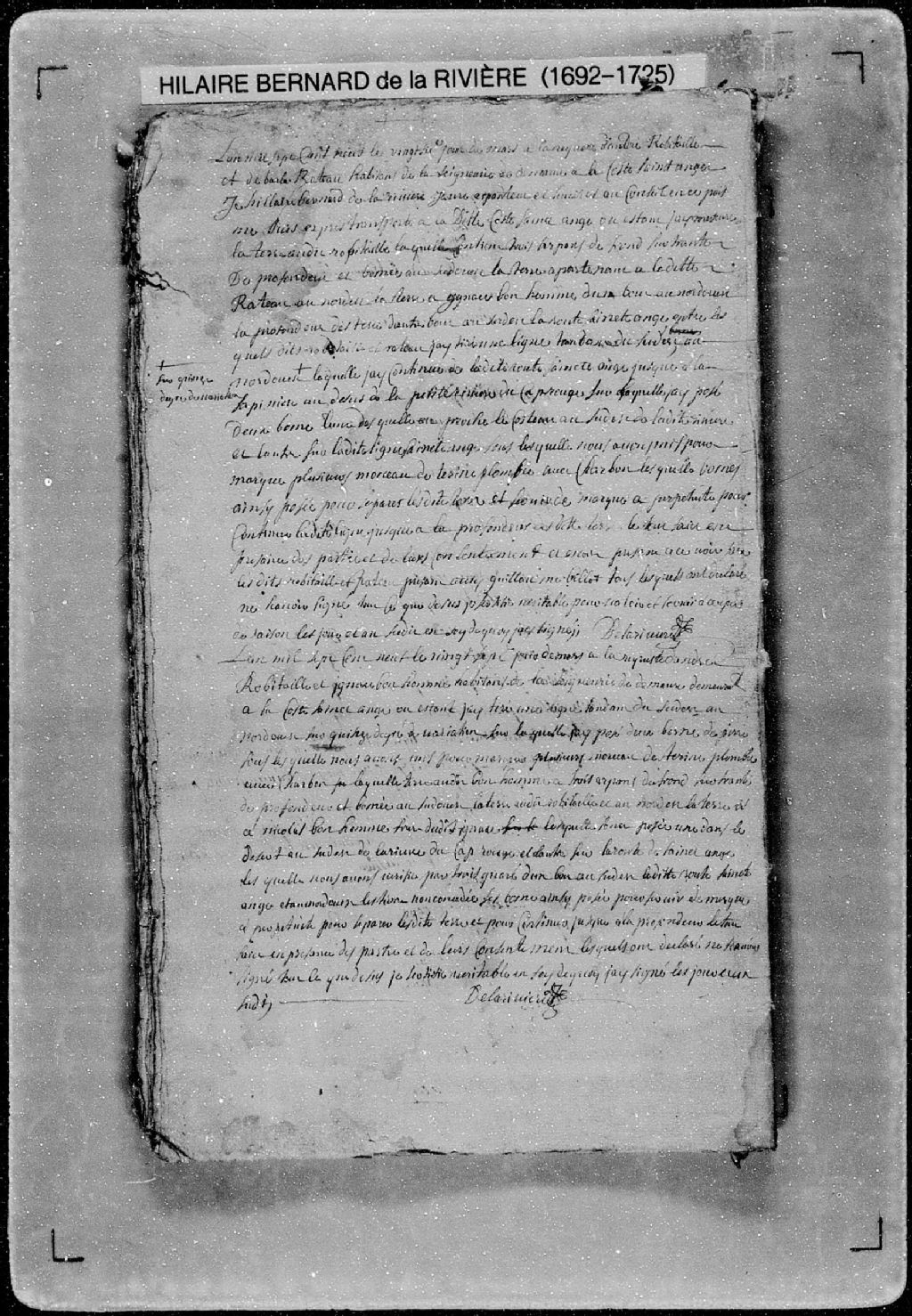 Procès-verbal de ligne et bornes séparant deux terres situées sur la rivière du Cap-Rouge et sur la route Saints-Anges, dans la seigneurie de Maur. La présente pièce concerne directement: André Robitaille, habitant de la seigneurie de Maur, demeurant à la côte Saints-Anges; Ignace Bonhomme, habitant de la seigneurie de Maur, demeurant à la côte Saints-Anges, frère de Nicolas Bonhomme (arpenteur Hilaire Bernard de Larivière), 27 mars 1709, Archives nationales à Québec, Fonds Cour supérieure. District judiciaire de Québec. Greffes d'arpenteurs, (03Q,CA301,S56,P229).