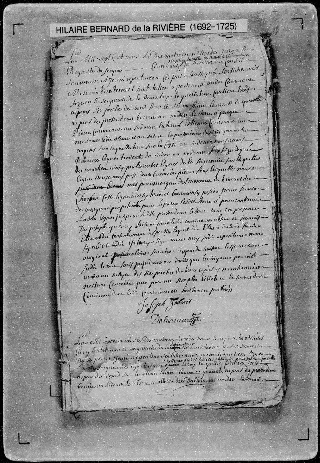 Procès-verbal de ligne et bornes séparant deux terres situées sur le fleuve Saint-Laurent, près du chemin du Roi, dans la seigneurie de La Durantaye. La présente pièce concerne directement: Étienne Roy, fils de Nicolas Roy, habitant en la seigneurie de La Durantaye; Alexandre Dallaire (Allaire) (arpenteur Hilaire Bernard de Larivière), 19 juin 1709, Archives nationales à Québec, Fonds Cour supérieure. District judiciaire de Québec. Greffes d'arpenteurs, (03Q,CA301,S56,P234).