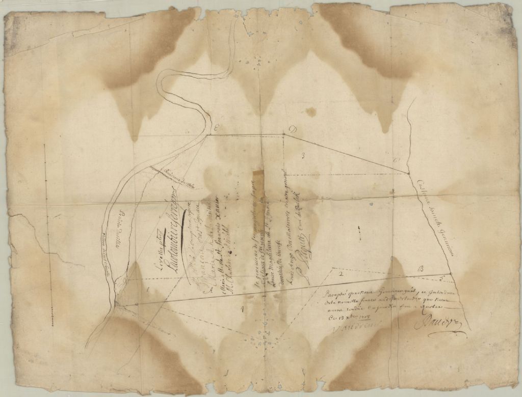 Plan d'arpentage quant à un échange de terres situées entre le coteau Sainte-Geneviève et la rivière Saint-Charles et attenant au ruisseau Saint-Laurent, au ruisseau du Trésor et aux prairies des Îlets, dans la [seigneurie de Notre-Dame-des-Anges]. La présente pièce concerne directement: l'Hôtel-Dieu de Québec; l'Hôpital général de Notre-Dame-des-Anges (arpenteur Hilaire Bernard de Larivière)