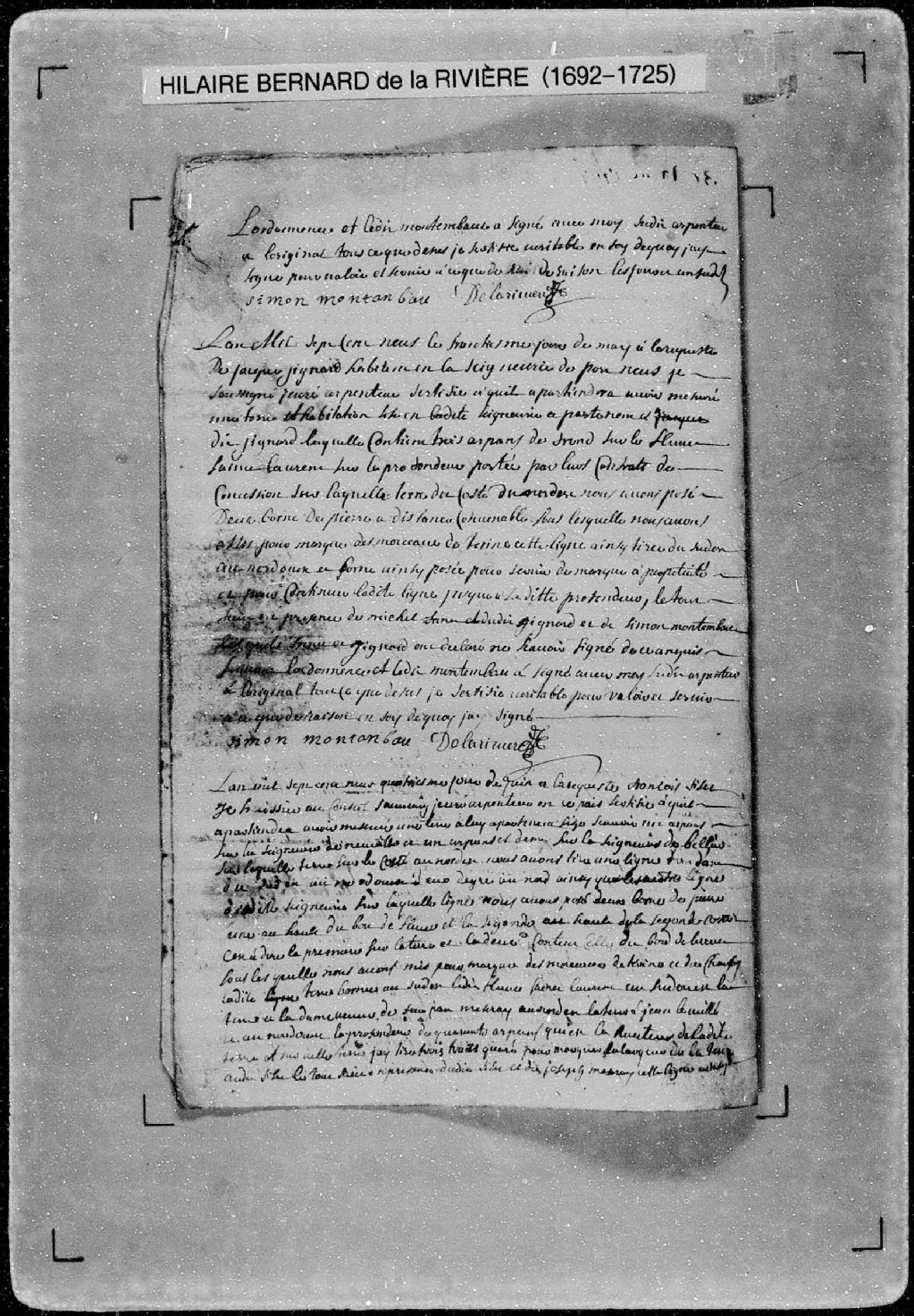 Procès-verbal de ligne et bornes séparant deux terres, dont une chevauche deux seigneuries, lesquelles terres étant situées sur le fleuve Saint-Laurent, dans la seigneurie de Neuville et la seigneurie de Bélair. La présente pièce concerne directement: François Fiset; Jean Léveillé (arpenteur Hilaire Bernard de Larivière), 4 juin 1709, Archives nationales à Québec, Fonds Cour supérieure. District judiciaire de Québec. Greffes d'arpenteurs, (03Q,CA301,S56,P247).