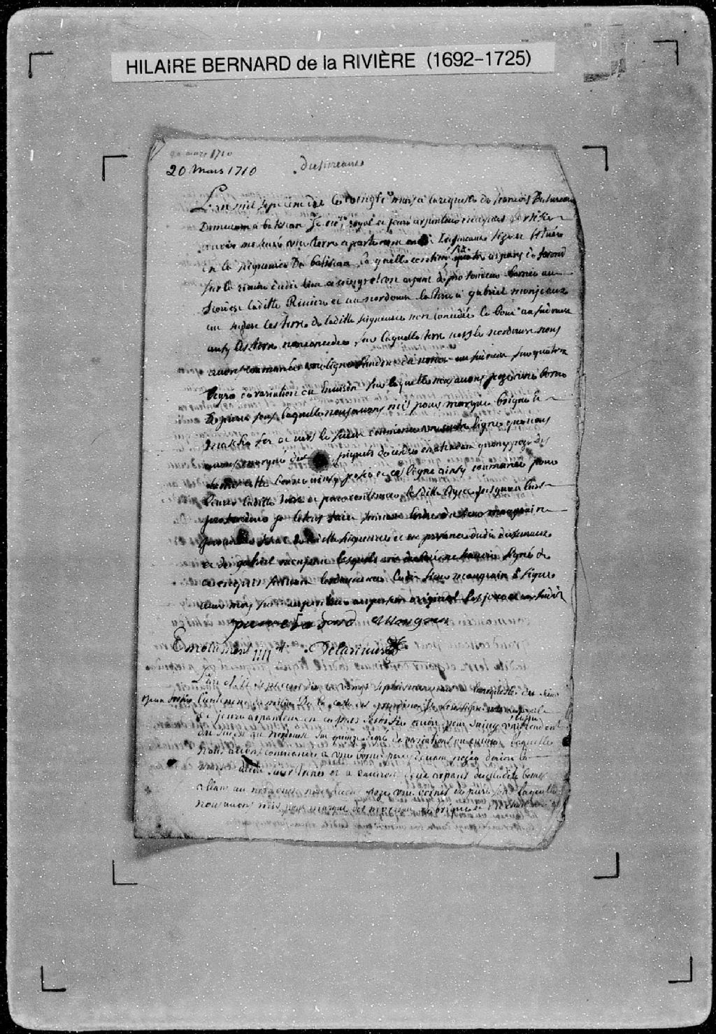 Procès-verbal de ligne et bornes séparant deux terres situées dans la seigneurie des Grondines. La présente pièce concerne directement: Jean Trotier (Trottier), lieutenant de milice de la côte des Grondines; Jean Joubain (Joubin, Jobin) (arpenteur Hilaire Bernard de Larivière), 27 mars 1710, Archives nationales à Québec, Fonds Cour supérieure. District judiciaire de Québec. Greffes d'arpenteurs, (03Q,CA301,S56,P275).