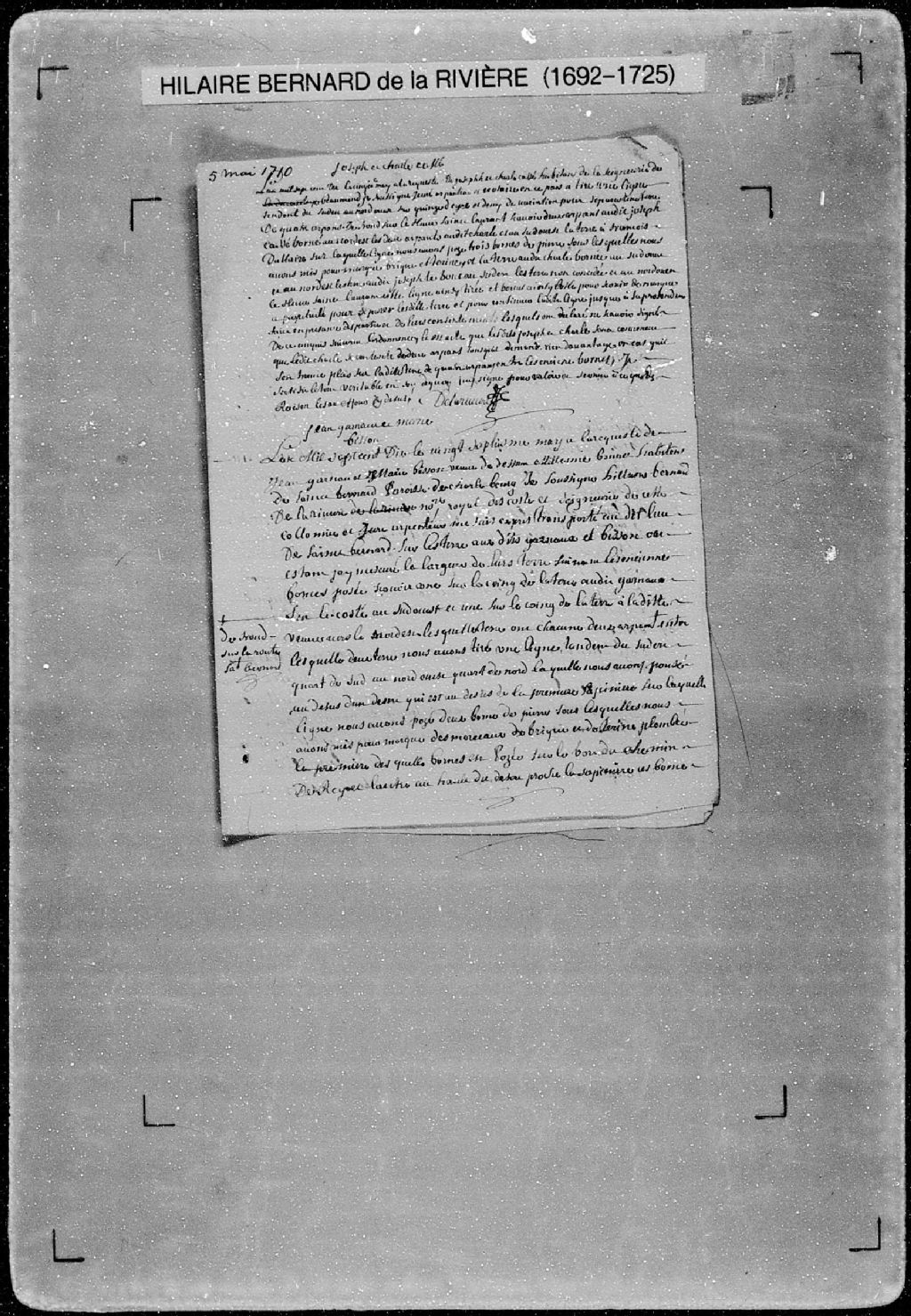 Procès-verbal de ligne et bornes séparant deux terres situées sur la route Saint-Bernard, près du chemin du Roi, paroisse de Charlesbourg. La présente pièce concerne directement: Jean Garnau (Garneau), habitant de Saint-Bernard, paroisse de Charlesbourg; Marie Bisson, veuve de Mélanie (Mélin) Bonnet, de son vivant habitant de Saint-Bernard, paroisse de Charlesbourg (arpenteur Hilaire Bernard de Larivière), 27 mai 1710, Archives nationales à Québec, Fonds Cour supérieure. District judiciaire de Québec. Greffes d'arpenteurs, (03Q,CA301,S56,P285).